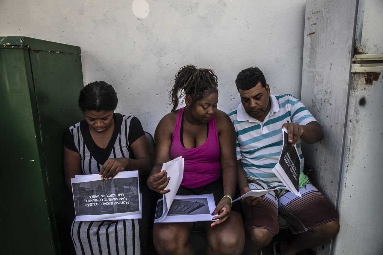 從左至右,安娜·伊麗莎白·本託·達席爾瓦、安娜·保拉·席爾瓦和保羅·羅伯託八月份在里約熱內盧羅西尼亞貧民窟閲讀培訓手冊。照片:《華爾街日報》的達多·加爾迪耶裏
