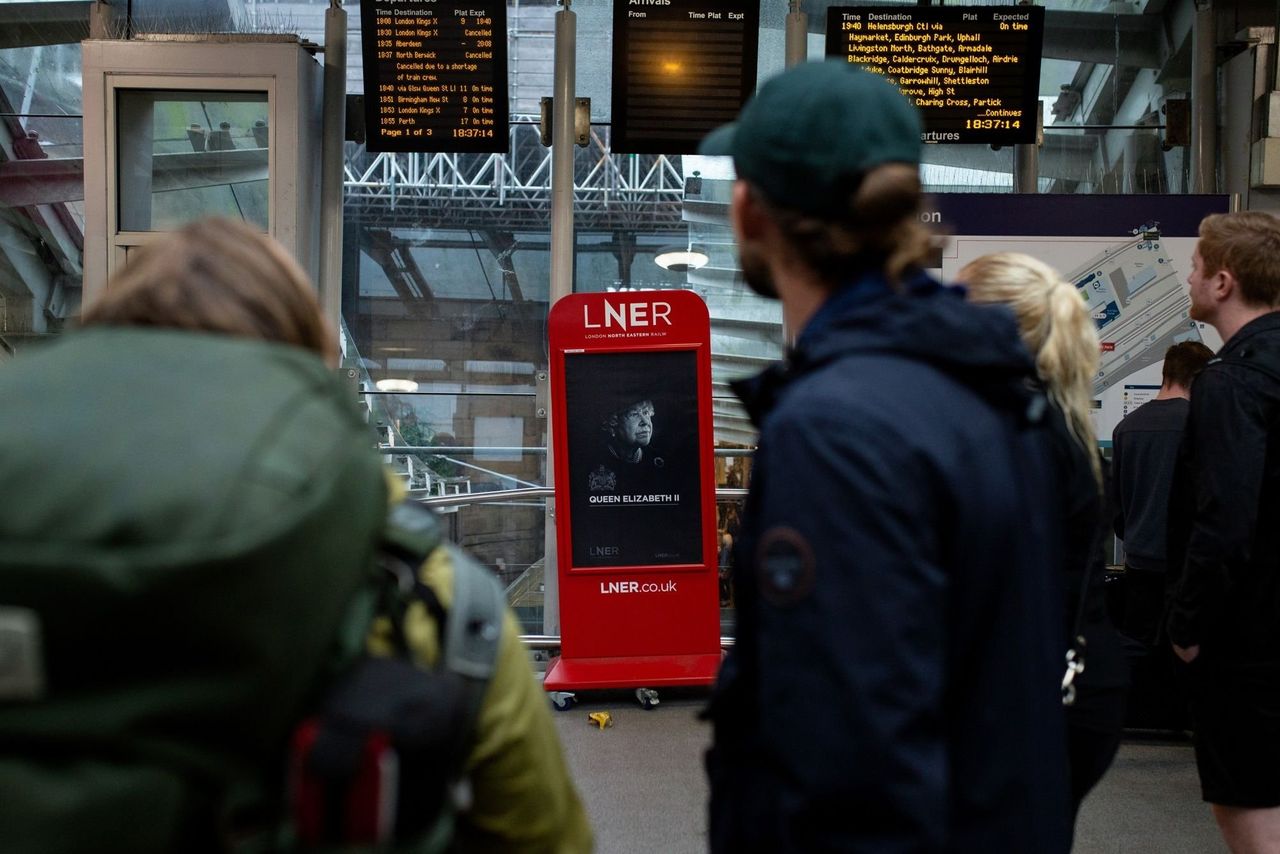 週日,蘇格蘭首府愛丁堡韋弗利火車站對女王的致敬。照片:Emily Macinnes/彭博新聞英國各地的公司和品牌紛紛在網上向女王致敬,通常將社交媒體資料中的彩色品牌換成單色。其中包括豬肉乾零食Peperami、DIY連鎖店Screwfix以及折扣服裝和家居用品零售商TK Maxx。在Alphabet Inc.的谷歌英國搜索主頁上,標誌的原色已被灰色調取代。