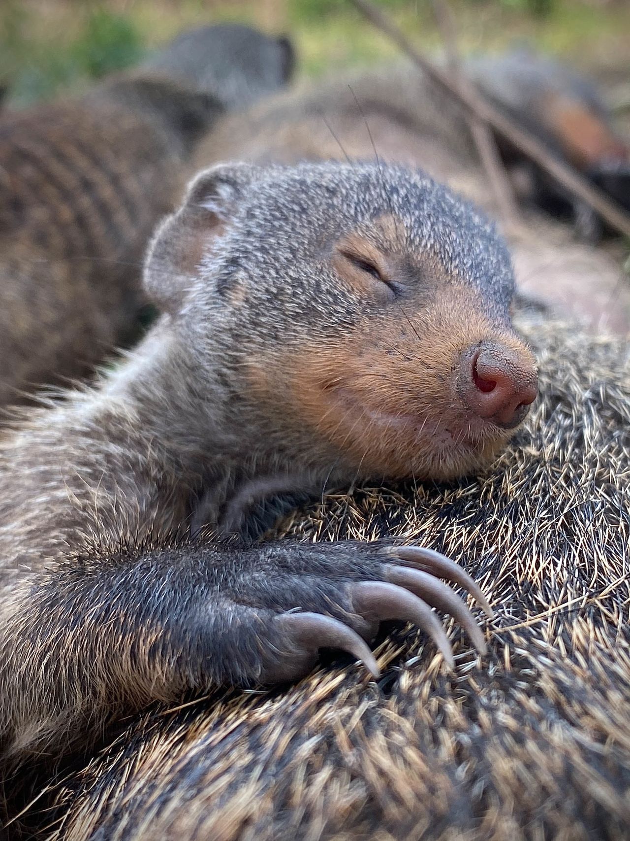 熟睡的貓鼬圖片來源:迪士尼+國家地理頻道每集結尾的説明(標題如“求偶遊戲”、“競爭對手”和“不可能的旅程”)指出:“部分鏡頭經過圖像增強或在受控條件下拍攝。”但“所有場景均呈現真實動物行為”——即便是人類這種動物的行為,儘管展現有限。“如果你以為已瞭解自然,”康伯巴奇先生在每章結尾説道,“請再想想。”在暴力與赤裸的性行為(比如小丑蝦之間)之間,《超/自然》提供了引發此類思考的素材,且全部源於真實。