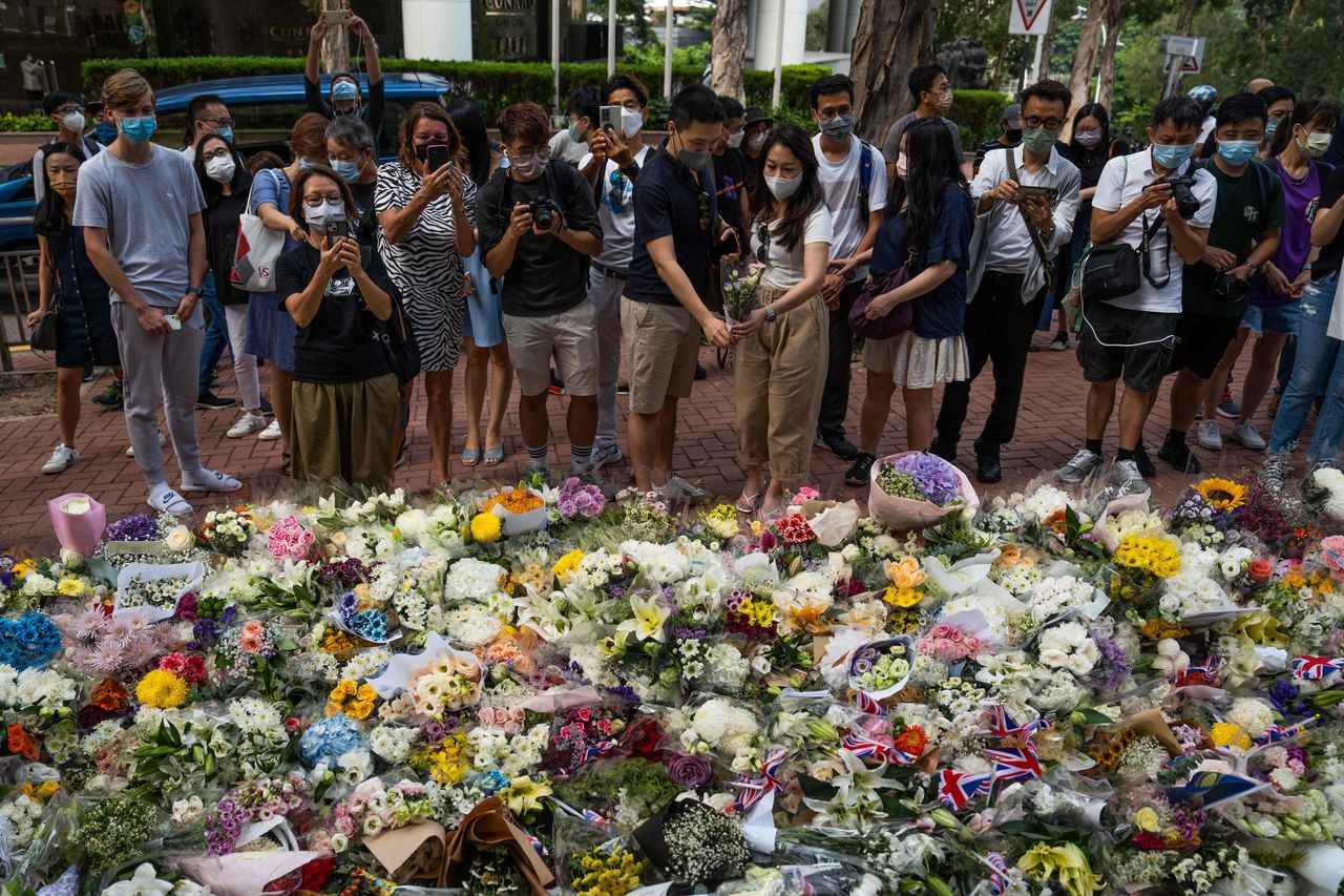 本月早些時候,人們拍攝了香港英國領事館外悼念伊麗莎白二世女王的鮮花。圖片來源:bertha wang/法新社/蓋蒂圖片社自中國採取行動壓制政治異見以來,已有數萬香港市民利用英國放寬的移民政策移居英國。