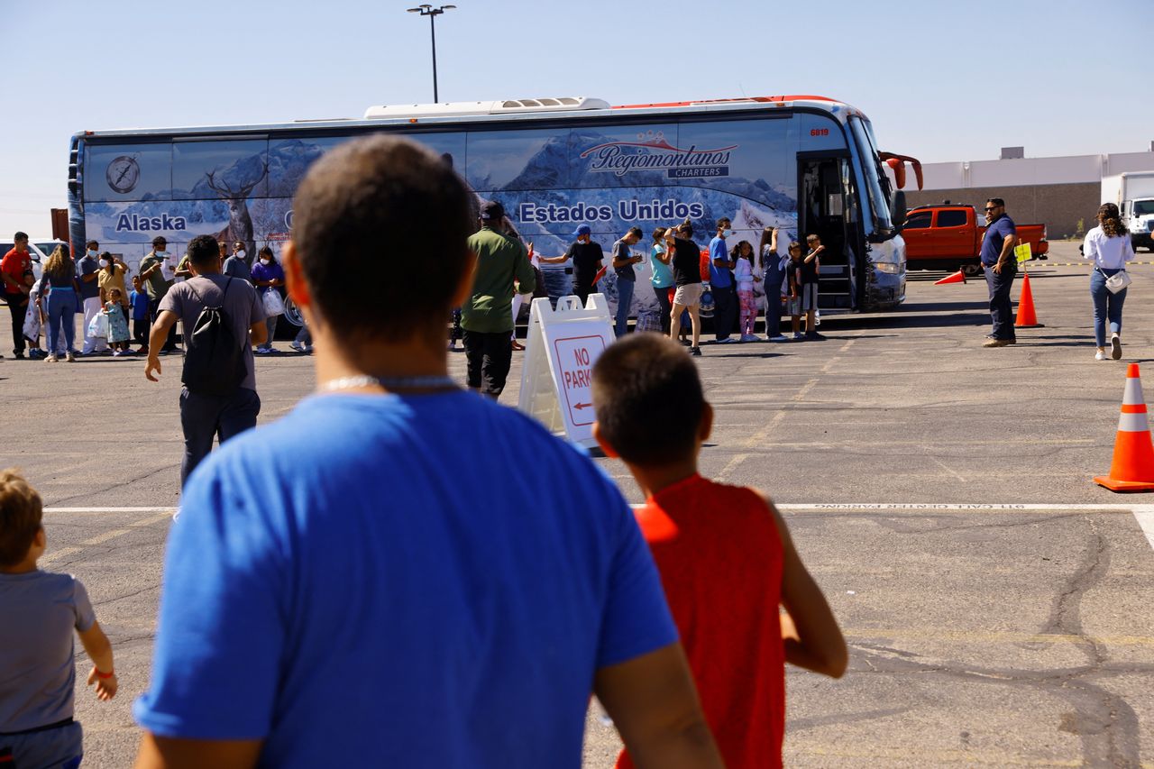 9月16日,德克薩斯州埃爾帕索的移民歡迎中心,移民們等待登上前往紐約的巴士。照片:何塞·路易斯·岡薩雷斯/路透社刊登於2022年9月22日的印刷版,標題為《庇護城市同理心的考驗》。