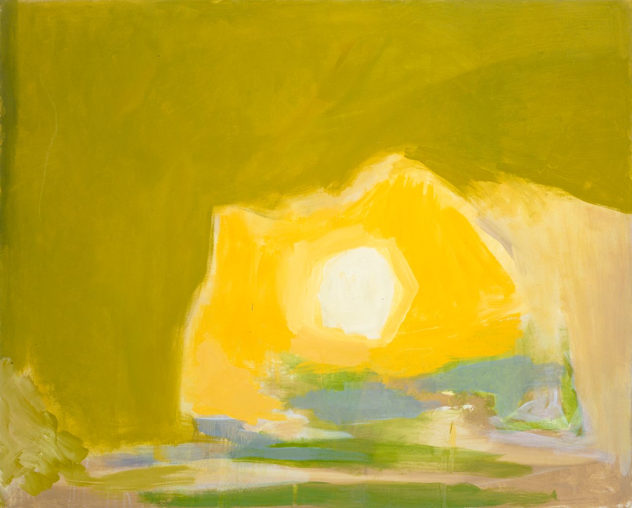 埃斯特萬·維森特的《花中之花》(1997年)圖片來源:哈里特與埃斯特萬·維森特基金會這些充滿鮮明綠色和柔和黃色的構圖,喚起了東區的小溪、池塘、海灘、沼澤和農田。《綻放》(1997年)和《花中之花》(1997年)以重疊的蛋黃狀形態為核心,而《綠色》(1998年)和《鄉村》(1999年)則更為散漫,如同沒有明確邊界的田野。有時彷彿維森特正從高空俯瞰他的社區。