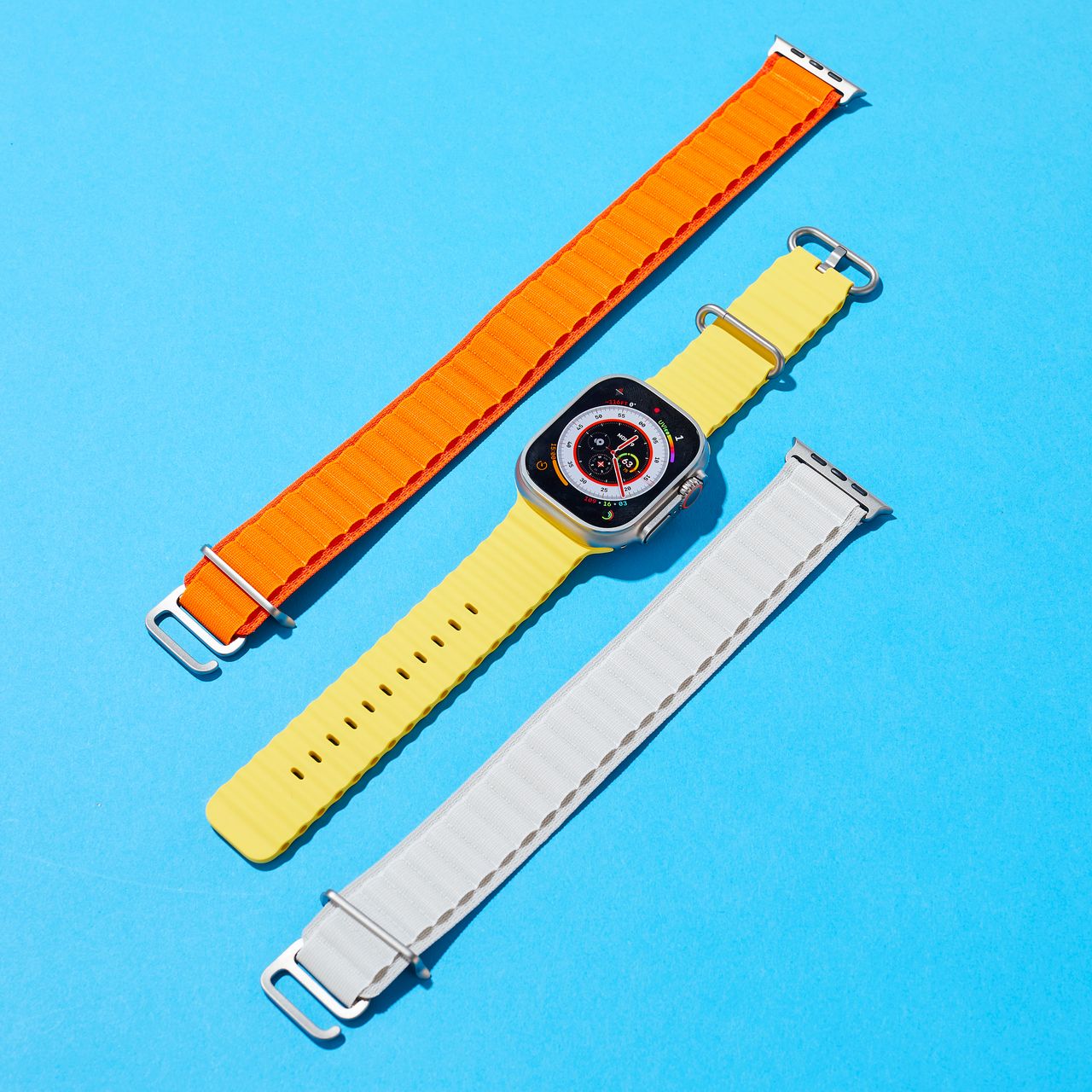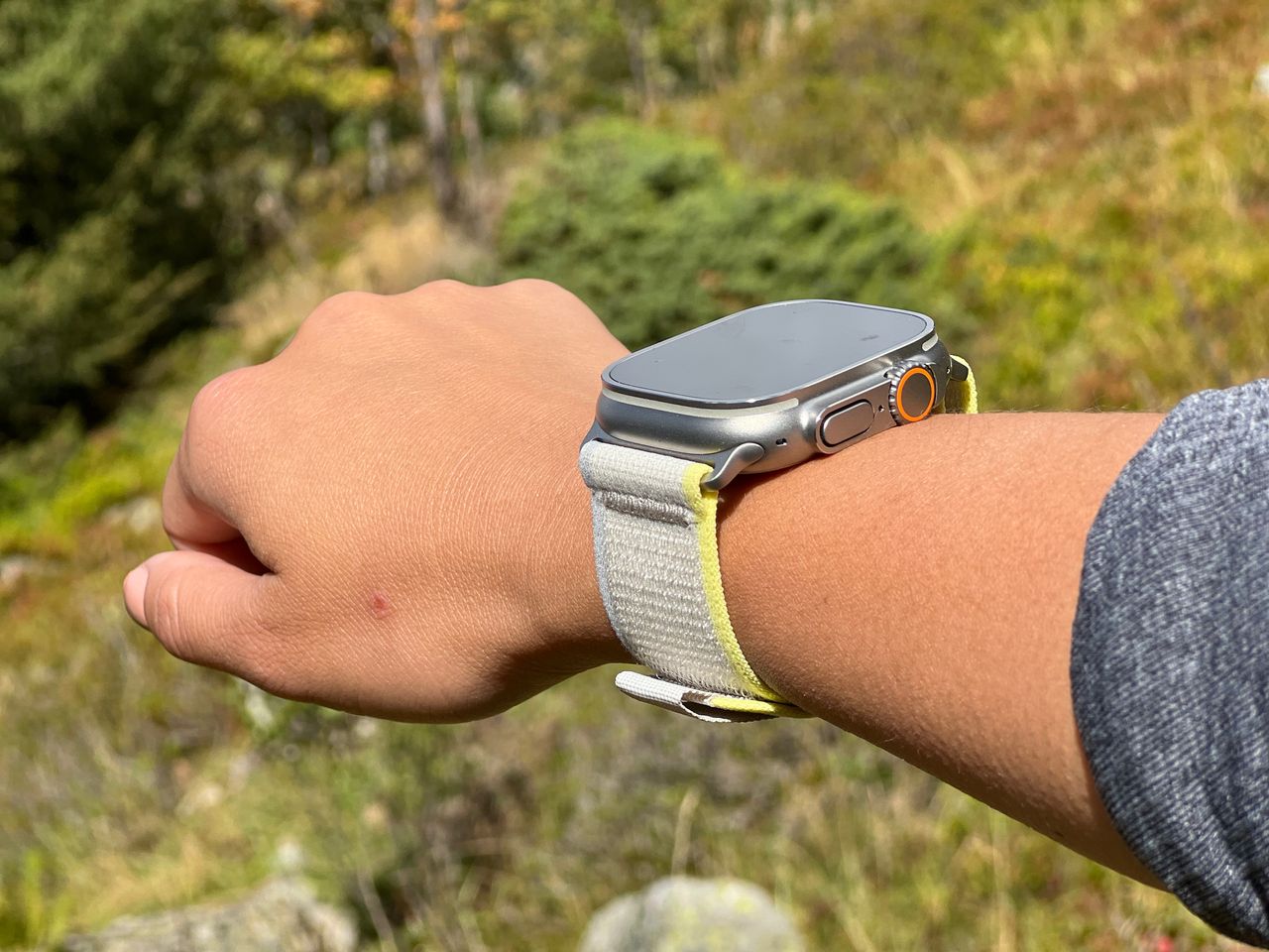 在Ultra上,我從笨重的Alpine錶帶換成了更輕薄、更靈活的Trail Loop錶帶。我不小心用髒樹枝蹭到了淺米色錶帶面料,立刻留下了污漬,但這條錶帶讓手錶在手腕上佩戴起來更加舒適。