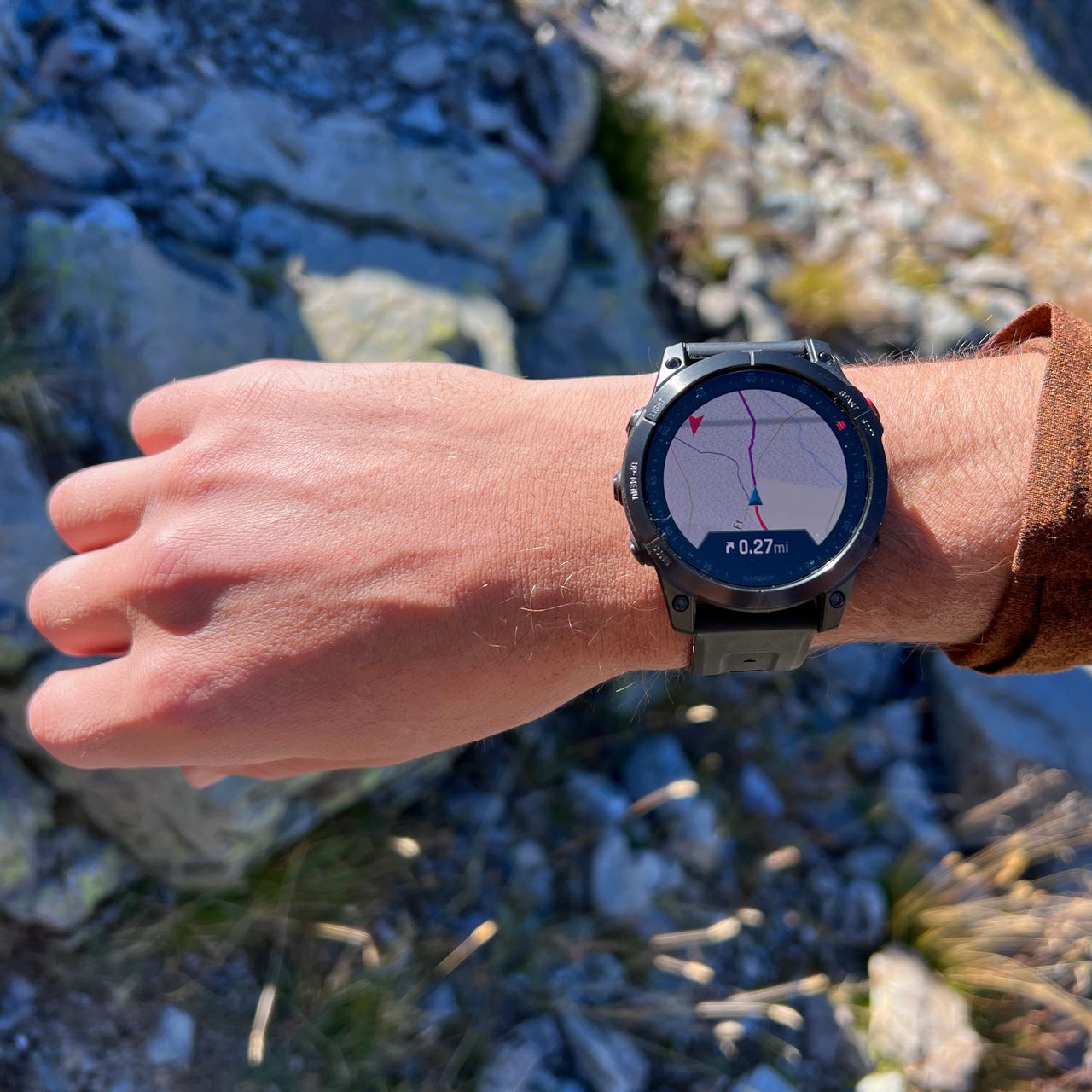 徒步出發前,我已將規劃路線下載到Garmin手錶。當遇到岔路口時,無需掏出手機確認位置,只需查看Will手腕上的Epix——地圖上的紫色路線指示右轉,藍色箭頭則顯示我們面對的方向。