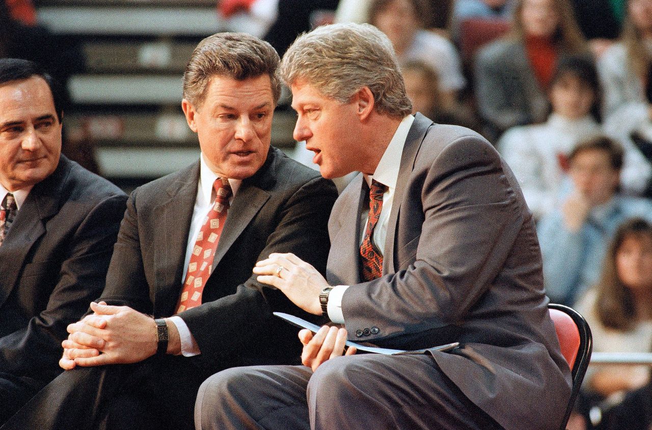 1993年,新澤西州州長吉姆·弗洛里奧與總統比爾·克林頓在羅格斯大學。圖片來源:馬西·奈特斯旺德/美聯社弗洛里奧先生在一屆任期後被共和黨人克里斯蒂·惠特曼趕下台,惠特曼利用了選民對增税的憤怒,以約26,000票的優勢贏得了選舉。