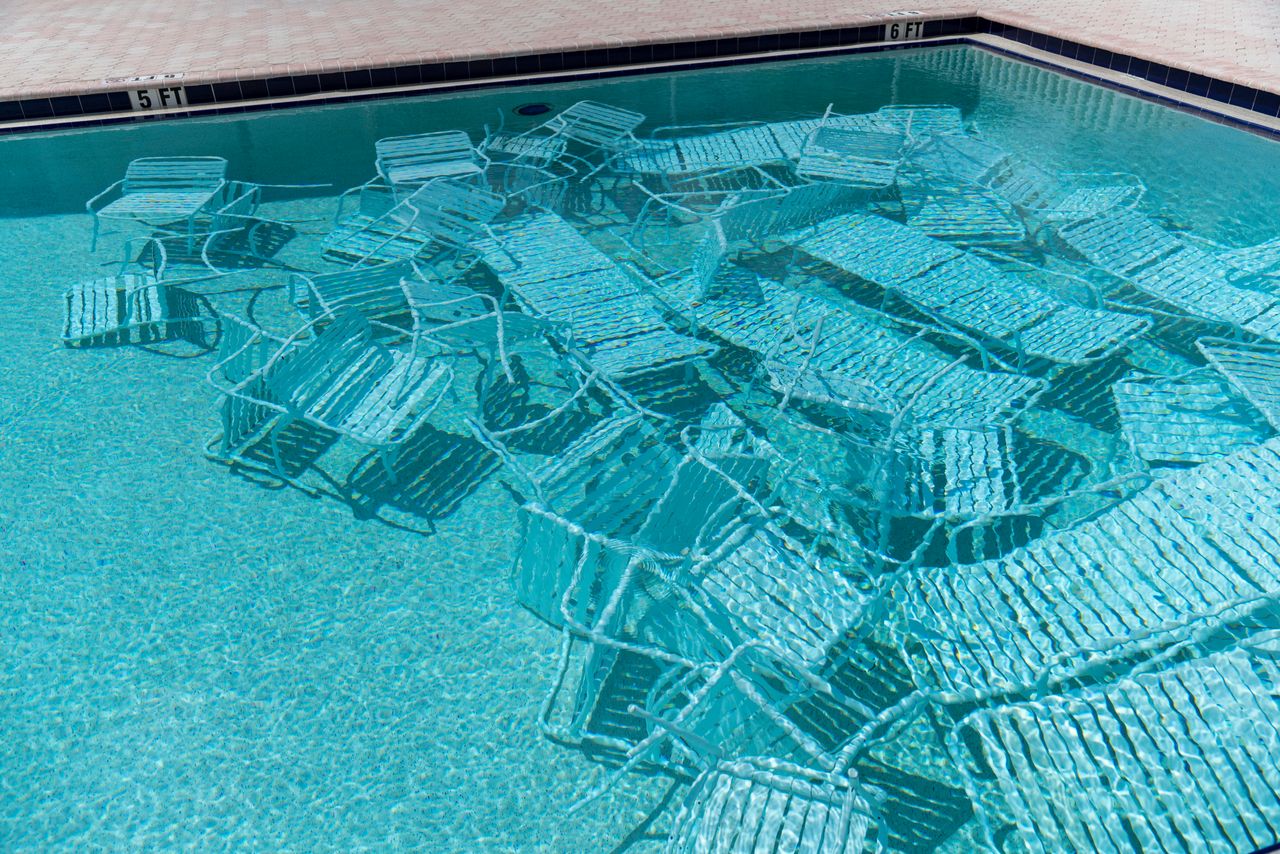 週一,佛羅里達州南帕薩迪納的公寓中,泳池椅被儲存在水下,為颶風“伊恩”做準備。圖片來源:瑪莎·阿森西奧-萊茵/坦帕灣時報/Zuma Press聯繫萊斯利·西斯姆,郵箱:[email protected]