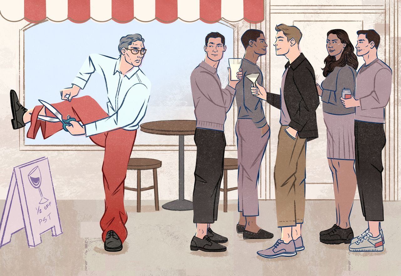 時尚捷徑 年長男性能否駕馭與千禧一代金融才俊掛鈎的露踝九分褲?插圖:保羅·圖勒在我漫長人生的大部分時間裏,我對褲長始終保持着一種刻意的漠然。任由牛仔褲堆在鞋面上,無視繁瑣的卷邊概念,偶爾被褲腳絆倒便自我解嘲為"喜劇調劑"。但過去幾年間,我注意到講究品味的千禧一代男性總穿着九分褲昂首闊步,而我和許多年過半百的同齡人一樣,終日拖着邋遢及地的褲腿踟躕前行。