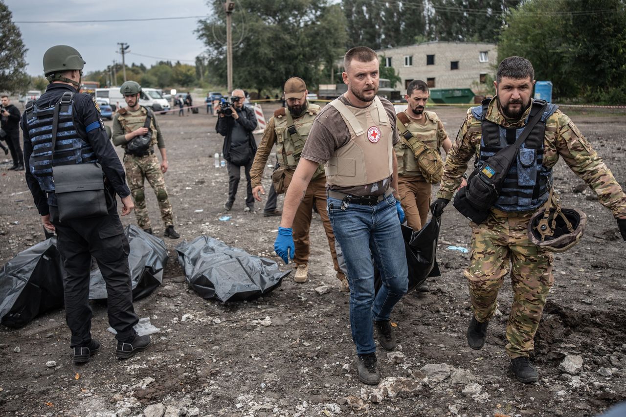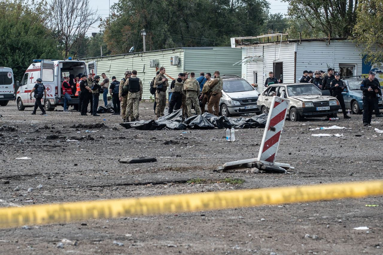 在扎波羅熱市附近遭襲後,醫護人員、警察和士兵們將遺體搬運上救護車。