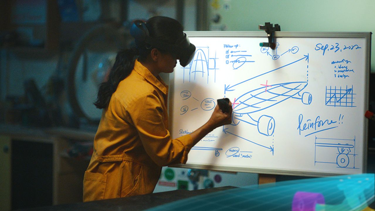 會議結束後,你回到現實中的家庭辦公室,但眼前懸浮着三塊巨型虛擬顯示屏。牆上掛着寫有勵志標語的虛擬白板:團隊協作!