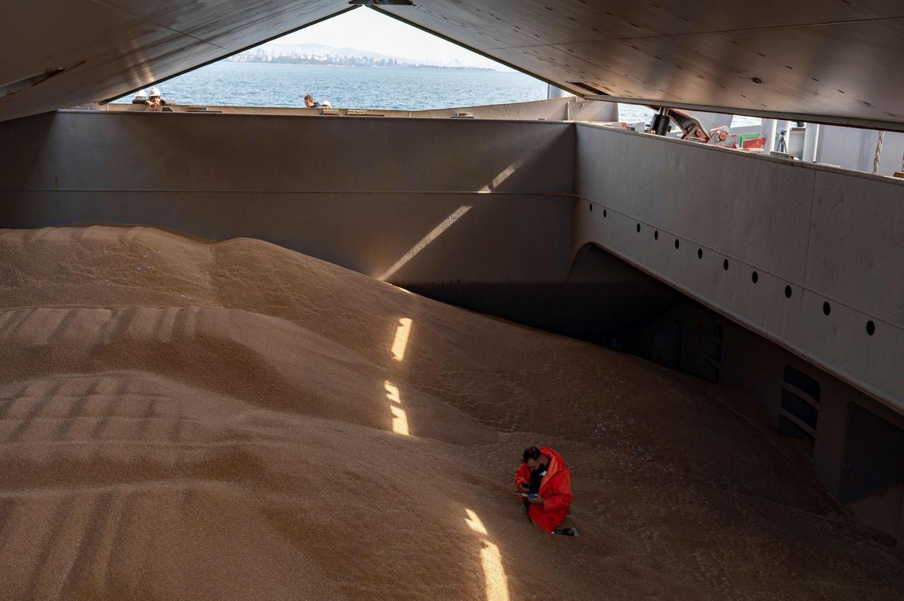 一艘載有烏克蘭穀物的貨輪停泊在伊斯坦布爾。圖片來源:YASIN AKGUL/AGENCE FRANCE-PRESSE/GETTY IMAGES"我們必須確保糧食運輸持續進行,“埃爾多安在哈薩克斯坦首都阿斯塔納與普京並肩而坐時簡短表態。