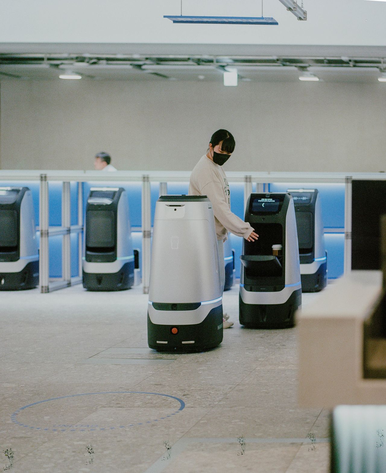 韓國城南市——在韓國最大互聯網公司的新總部,一支自動駕駛機器人隊伍正忙碌地穿梭,遞送咖啡、午餐盒和郵件包裹。