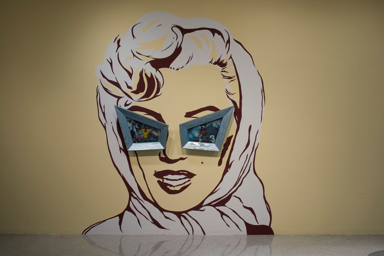 亞歷克西斯·史密斯的《星光》(1982年)攝影:MCASD然而展覽中最引人注目的作品當屬1985年的《戴眼鏡的姑娘很少被搭訕》——這幅大型黑白(無灰度)牆畫描繪了繫着絲巾的瑪麗蓮·夢露,其太陽鏡由兩個四邊形拼貼畫構成。