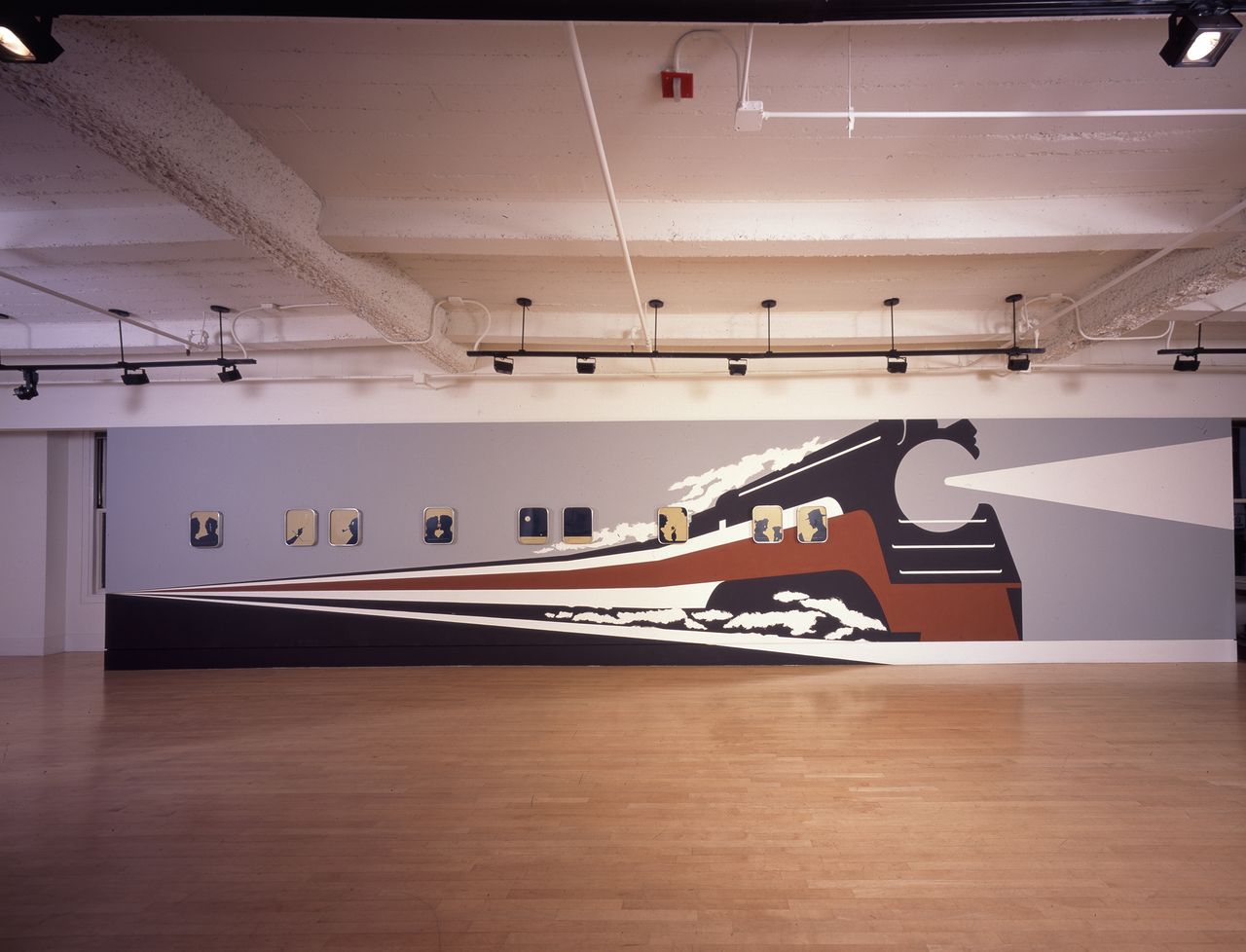 儘管從未放棄創作,史密斯女士那些看似隨意卻暗含反諷的精緻拼貼很快演變為包含橫向排列拼貼的裝置作品。《走鋼絲》《日落》與《金州》(均創作於1980年)被安置在純白展廳中,配以時代廣告片段彩繪、垂直的紫藤條紋和城市天際線(在原展館版本中地面鋪滿沙子)。此後她轉向更宏大的創作:1981年為《波吉與貝絲》創作的《應許之地——致佩吉》將巨型鋼琴鍵繪於牆面;1982年的《星光》中,一列彩繪的流線型火車裝飾着金屬窗框內的乘客剪影拼貼,彷彿正沿牆面飛馳。這些作品均在拉霍亞展覽中得以重現。