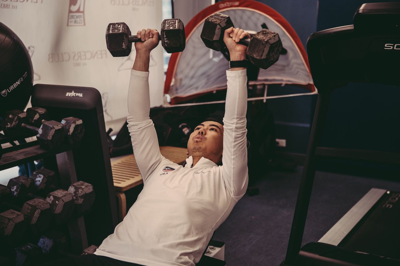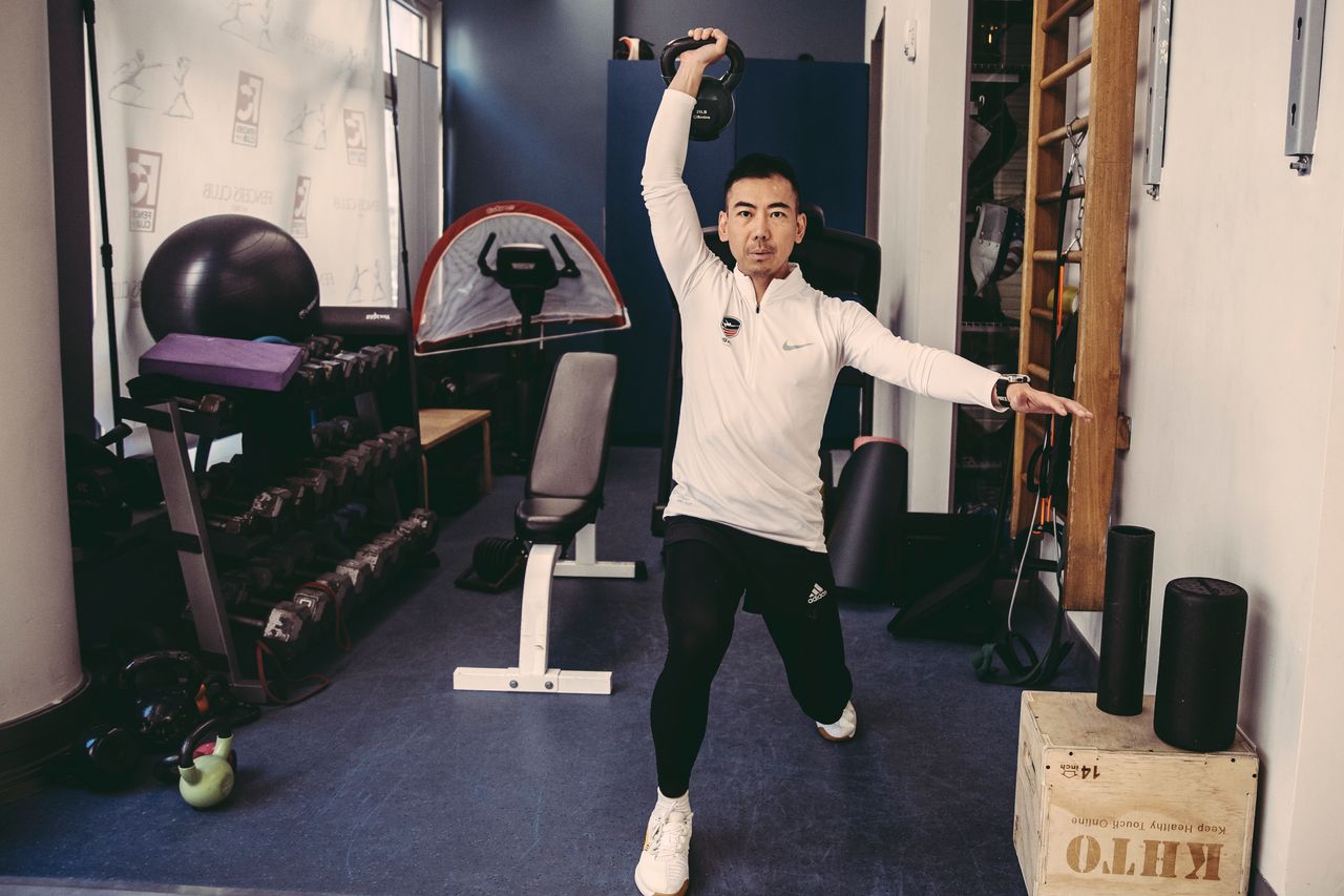 羅先生在健身房通過壺鈴訓練補充擊劍練習。照片:《華爾街日報》的Anthony Geathers