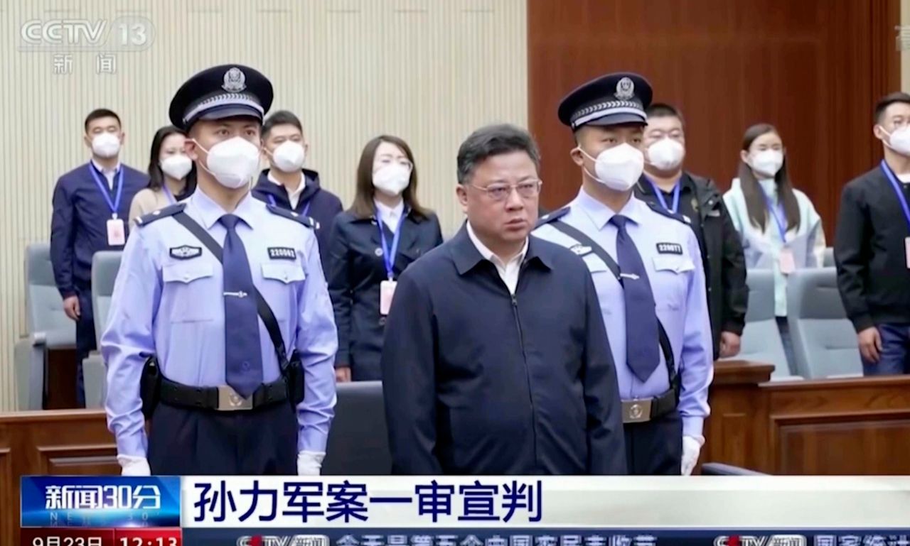 9月23日,孫力軍在法庭宣判時的畫面,該圖片取自視頻片段。圖片來源:美聯社該政黨於2021年9月開除孫某黨籍,並指控其存在政治和經濟違紀行為。官方媒體披露了其所謂"政治小集團"核心成員,包括前司法部長、某省原政法委書記及三名地方公安系統前高官——這些人員近期均因腐敗罪被判處十四年至無期徒刑不等的刑罰。