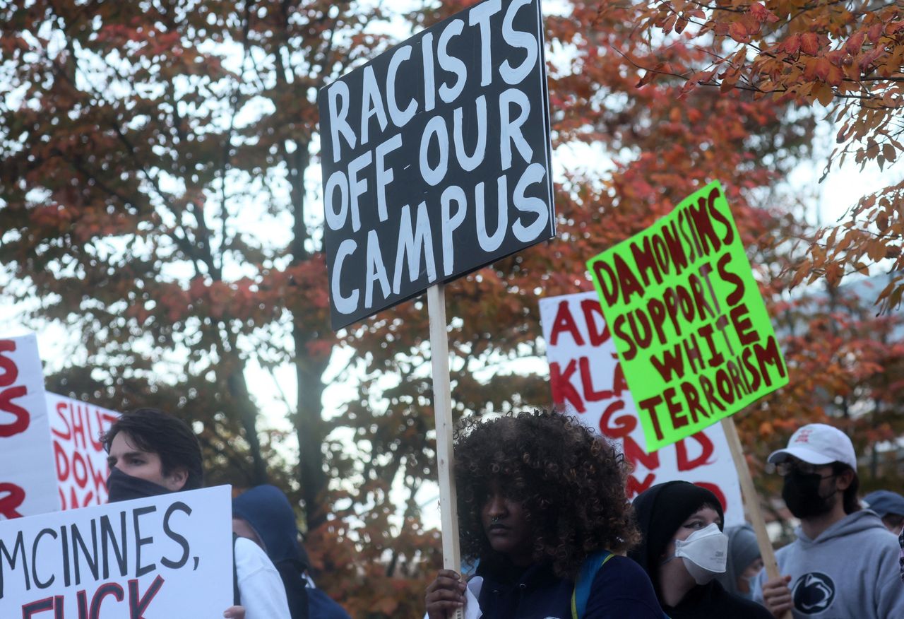 近日抗議者聚集賓州州立大學校園,學生和校方均譴責活動演講者。圖片來源:LEAH MILLIS/REUTERS名為"無審查美國"的學生言論自由俱樂部表示,原計劃在該活動中邀請兩位"政治挑釁性"演講者,活動名為"退後待命"。該名稱引用前總統唐納德·特朗普在2020年總統辯論中被要求譴責該組織時使用的措辭。