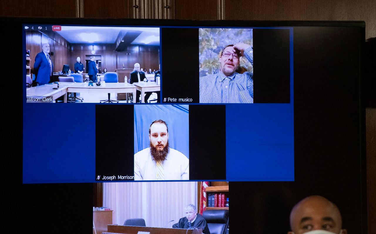 被告——右上角的皮特·穆西科和中間的約瑟夫·莫里森——通過遠程方式參加了週三的庭審。照片:J·斯科特·帕克/新聞池州檢方着重指出三名被告長期的反政府情緒及與執法部門的前科。檢察官稱,他們因共同認為政府侵奪其權利且需準備採取行動而結成同盟。