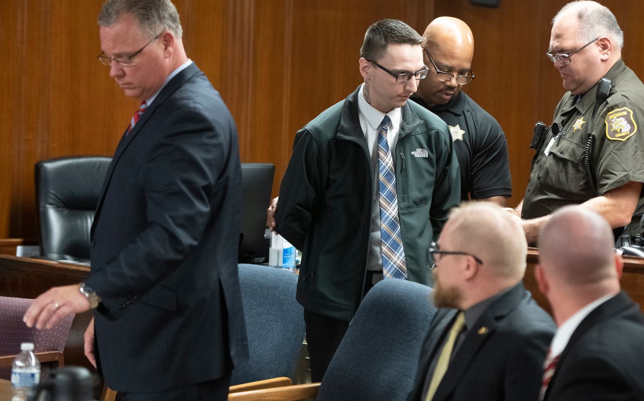 週三判決宣佈後,保羅·貝拉爾在密歇根州傑克遜市一家法院被拘留。圖片來源:J. Scott Park/Press Pool陪審團週三裁定三名男子密謀綁架密歇根州州長格雷琴·惠特默罪名成立,儘管辯護方稱他們只是空談犯罪並無實施意圖。
