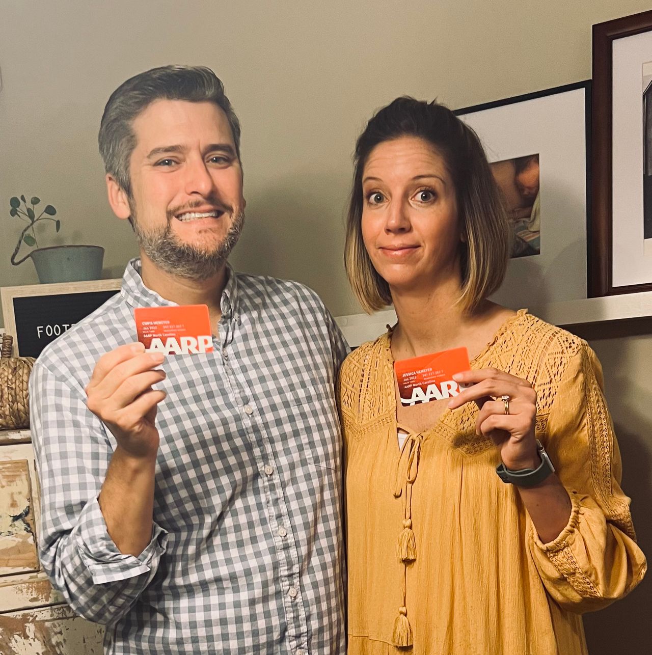 克里斯和傑西·海邁爾手持他們的AARP會員卡。攝影:保拉·丹尼爾斯克里斯·海邁爾表示,他三十多歲時就開始長白頭髮,所以拿到AARP會員卡感覺很合適。現年45歲、入會約兩年的海邁爾先生將他的AARP卡視為榮譽徽章。