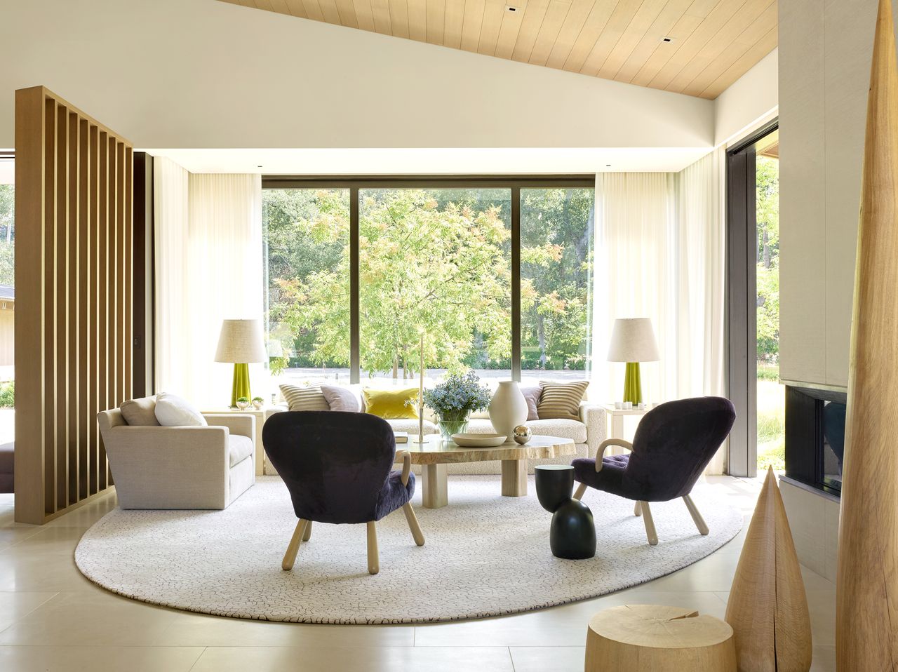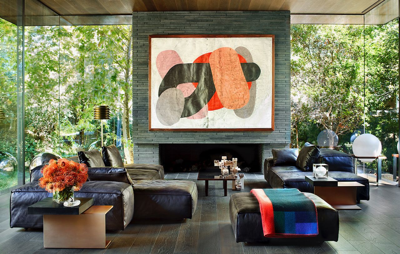 這間位於加州伍德賽德的客廳因所有傢俱都放置在一塊界定空間的區域地毯上而顯得和諧統一。設計來自舊金山公司Odada。攝影:馬修·米爾曼### 3. 單調乏味