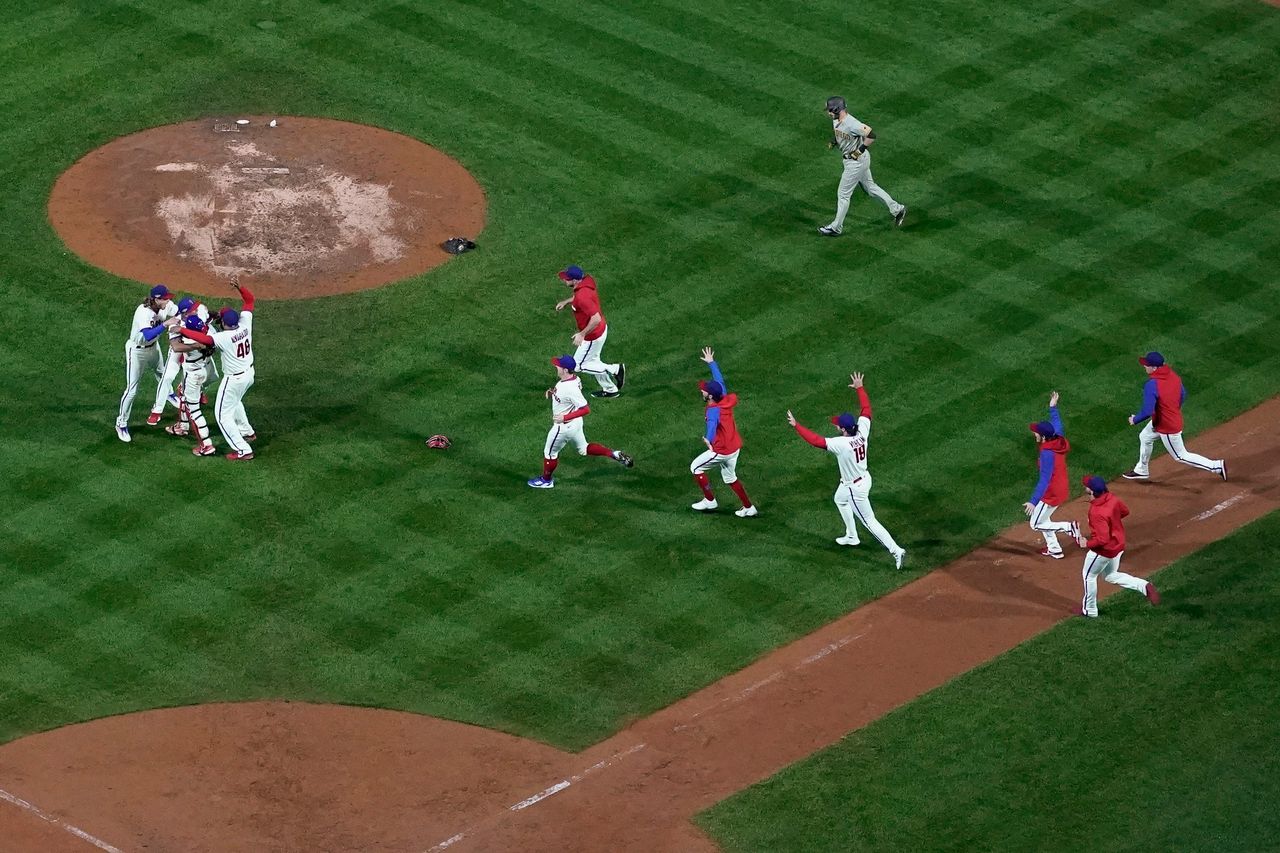 費城費城人隊贏得國家聯盟冠軍賽後慶祝。照片:馬特·斯洛克姆/美聯社