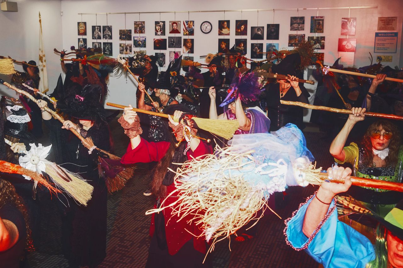 人們想聘請羅德島女巫協會進行快閃表演。照片:《華爾街日報》的西蒙·西馬德這段舞蹈本質上是一系列配合掃帚完成的簡單動作。參與者首先繞着掃帚行走,然後橫向握住掃帚,前後移動時交替將掃帚上舉兩次下壓兩次。接着,他們在掃帚前左右旋轉。