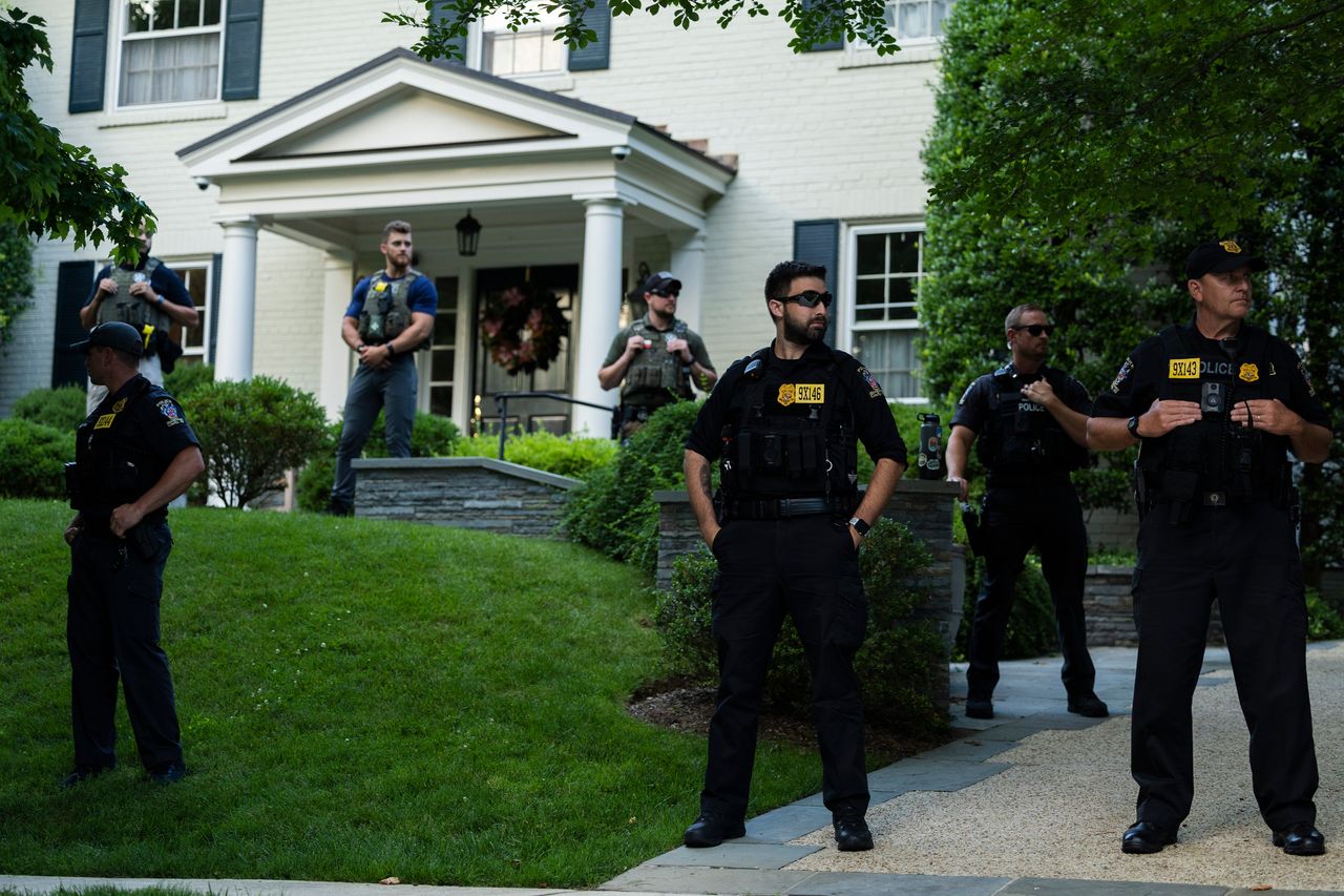 6月29日,執法人員在美國馬里蘭州切維蔡斯鎮首席大法官羅伯茨住所外警戒,抗議者正在遊行。照片:安娜·馬尼梅克/蓋蒂圖片社刊登於2022年10月31日印刷版,標題為《公眾有權知道誰泄露了多布斯案草案》。
