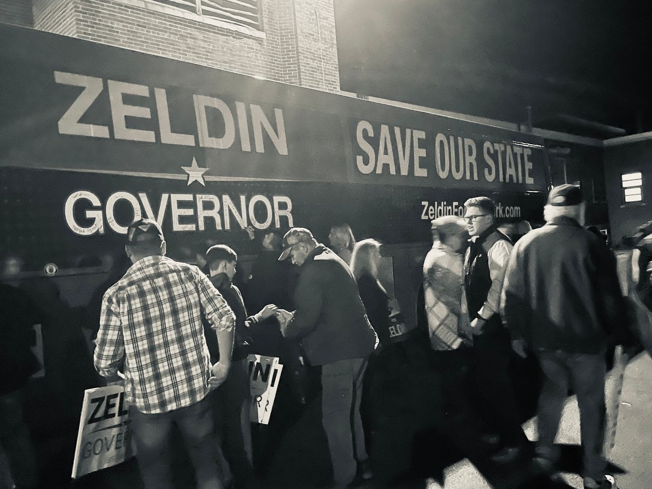 紐約州共和黨主席尼克·蘭沃西正在競選該州第23國會選區席位——這是位於該市南部一個共和黨穩佔優勢的開放席位。作為澤爾丁登場前的暖場嘉賓,他發表了傳統的地方性煽動演説,在舞台上踱步,高聲吶喊,要求觀眾回應。他將2021年8月接替安德魯·科莫上任的州長霍楚爾稱為"意外州長”,宣稱其"氣數已盡”。對於紐約自2002年喬治·帕塔基贏得第三任期後再未選出共和黨州長的事實,他毫不擔憂,稱澤爾丁正在"釋放新的選票"。