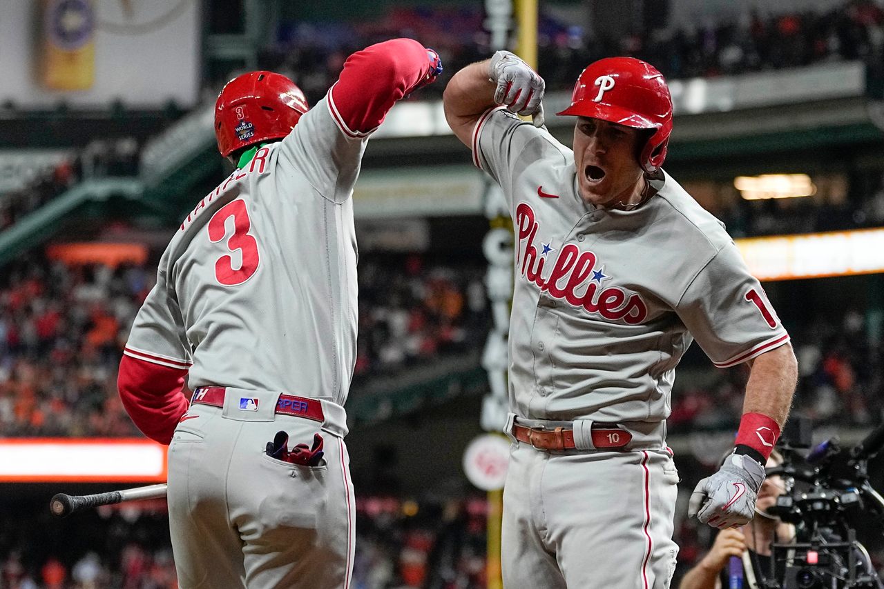 JT·瑞爾穆託(右)與布萊斯·哈珀在世界大賽第一場慶祝勝利。圖片來源:埃裏克·蓋伊/美聯社費城人棒球隊為這份自信再添底氣,他們為這座城市和棒球季後賽撒下了魔法金粉。儘管薪資豐厚,費城人隊賽季初表現糟糕,六月時用温和的臨時教練羅伯·湯姆森取代了喬·吉拉迪。他們作為國聯東區球隊(落後勇士隊和大都會隊)勉強擠進季後賽,卻在十月所向披靡——先後淘汰熱門紅雀隊、勇士隊,又在國聯冠軍賽擊沉教士隊,將與勁旅休斯頓太空人展開秋季經典對決。