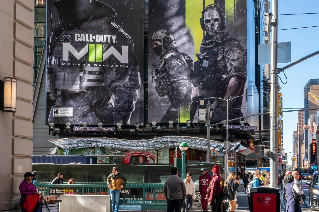 動視公司電子遊戲《使命召喚:現代戰爭II》的廣告牌。圖片來源:Richard B. Levine/Levine-Roberts/Sipa USA/Reuters幻想類電子遊戲仍能造成現實世界的傷害,但一個已有19年曆史的遊戲品牌也證明了自己極難被擊敗。
