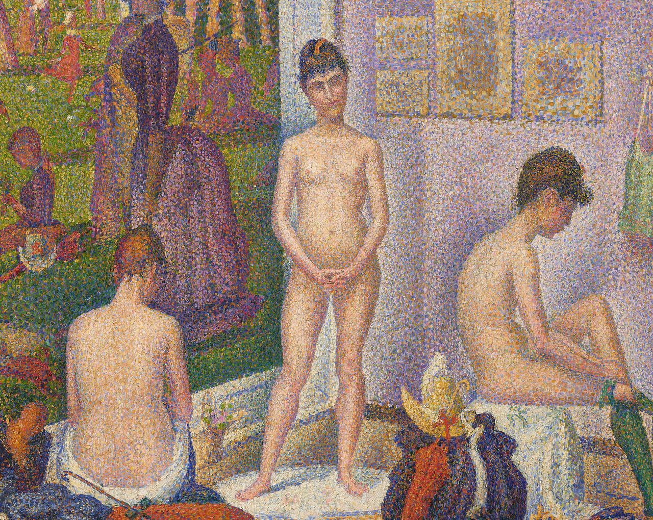 保羅·塞尚的《聖維克多山》以1.378億美元成交。圖片來源:佳士得影像有限公司 2022修拉價值1.492億美元的《模特們,合奏(小版本)》成為當晚的明星。這幅1888年創作的餐墊大小的畫作描繪了三位女性,暗示了他早期為費城巴恩斯基金會創作的同一主題更大尺幅場景。該作品原估價僅1億美元,但四位競拍者將其推至更高價。