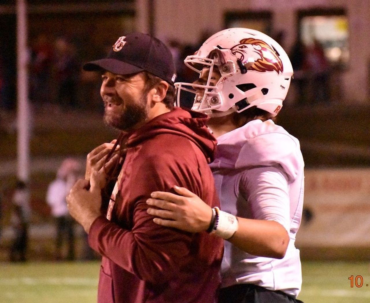 前希伯倫基督教學院四分衞科爾頓·高希爾與當時的教練傑夫·薩特迪擊拳。照片:克里斯蒂·高希爾週六還深刻體會到了高中業餘橄欖球與職業聯賽之間的殘酷差距,這跟球員需要攻防兼顧毫無關係。他不得不為預算問題絞盡腦汁。