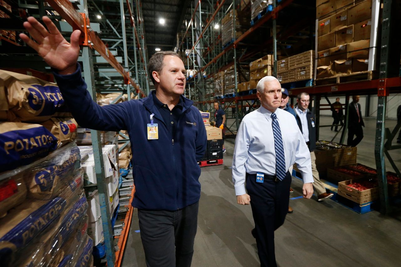沃爾瑪CEO董明倫(左)與時任美國副總統彭斯參觀弗吉尼亞州戈登斯維爾配送中心照片:史蒂夫·赫爾伯/美聯社