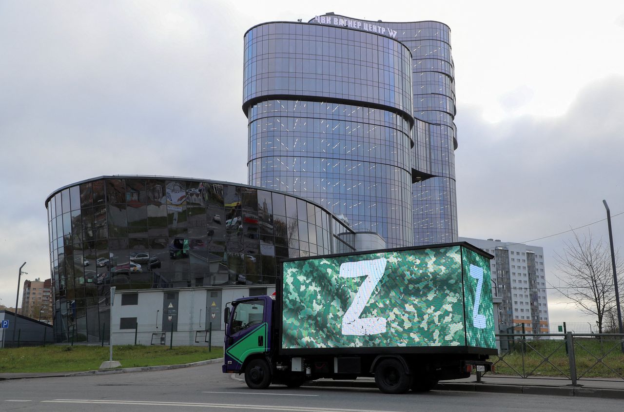 本月早些時候,俄羅斯聖彼得堡瓦格納集團辦公室外,一輛卡車展示着支持俄羅斯武裝部隊的"Z"符號。圖片來源:IGOR RUSSAK/REUTERS努津雙手被綁,頭被膠帶固定在水泥塊上,他説出了自己的名字和出生日期,並表示自己在9月4日改變了立場。