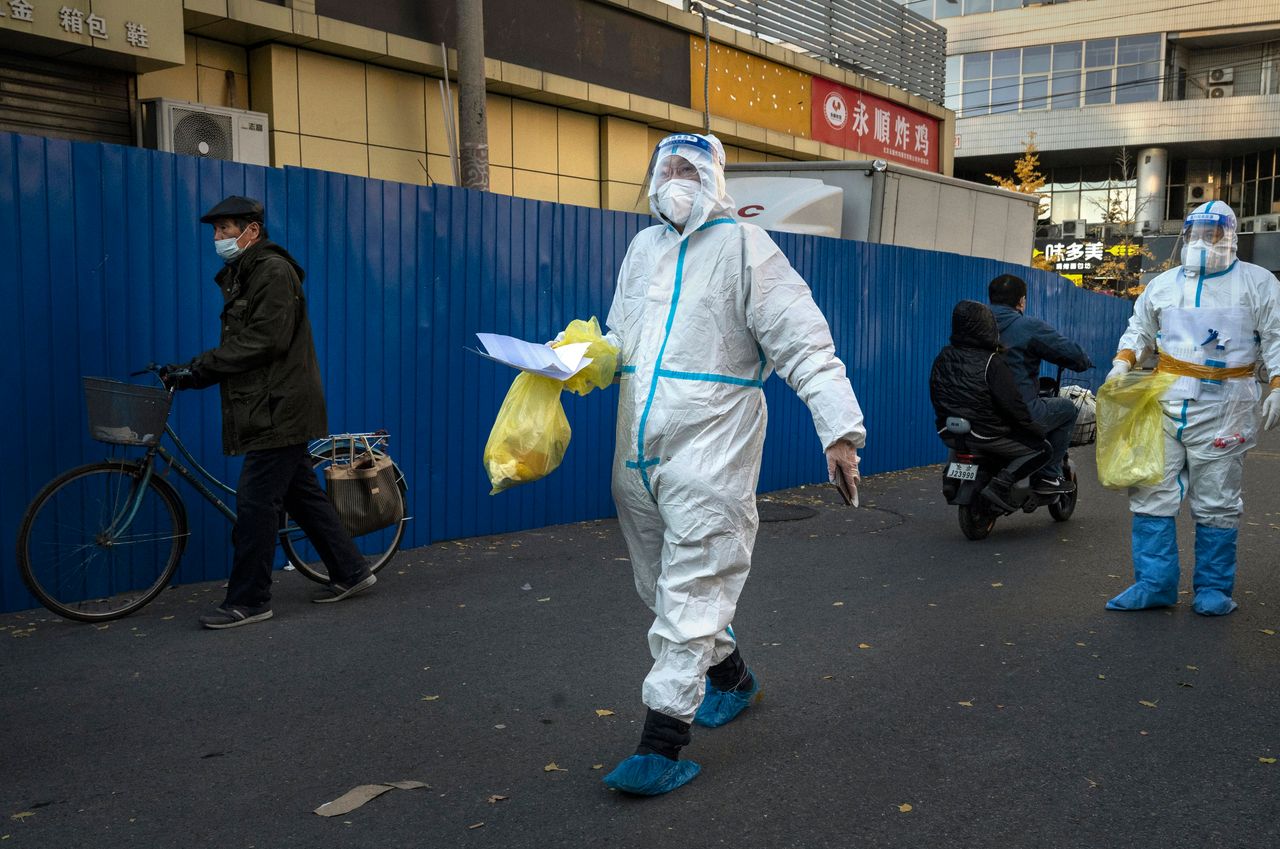 北京新冠病例激增,本週疫情防控人員正在開展工作。圖片來源:Kevin Frayer/Getty Images國家統計局週二表示,2022年前10個月商品房銷售額同比下降28.2%,而前9個月同比下降28.6%。