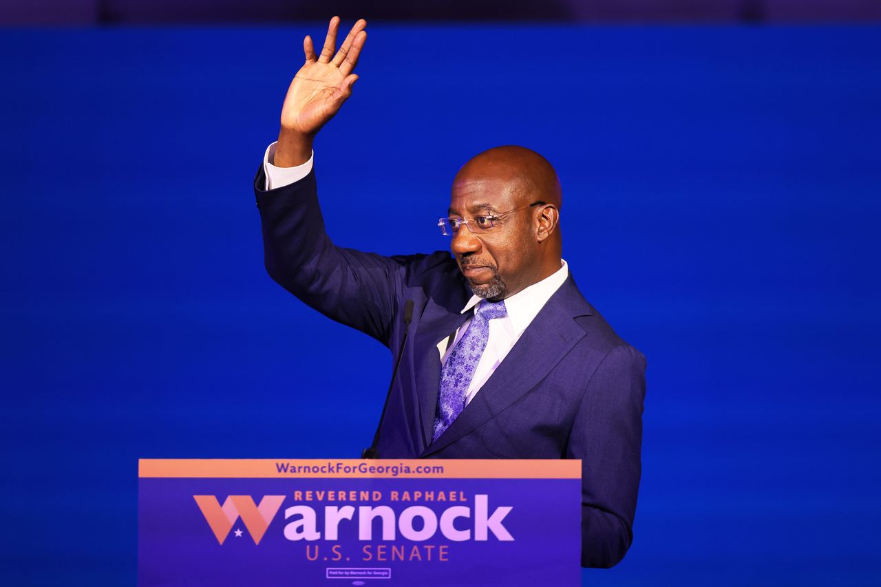 佐治亞州民主黨參議員拉斐爾·沃諾克在亞特蘭大選舉之夜派對上發表演講後揮手致意。照片:邁克爾·M·聖地亞哥/蓋蒂圖片社刊登於2022年11月15日印刷版,標題為《為何佐治亞州依然重要》。