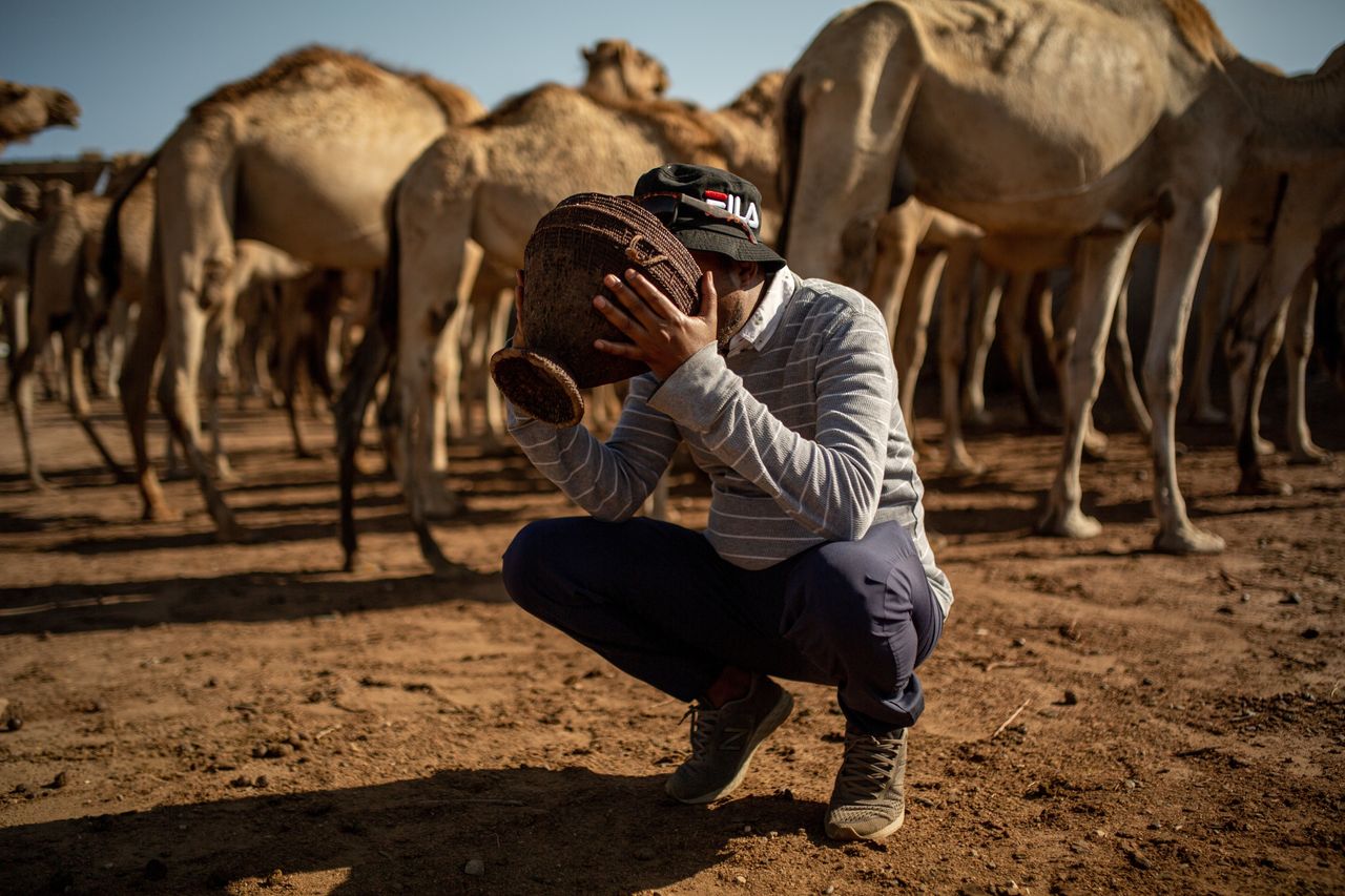 伊薩克先生從一個防水的編織籃中啜飲新鮮駱駝奶。2020年,他搬回索馬里蘭並與扎姆扎姆·哈桑結婚,為娶她向女方家庭支付了25頭駱駝的聘禮。