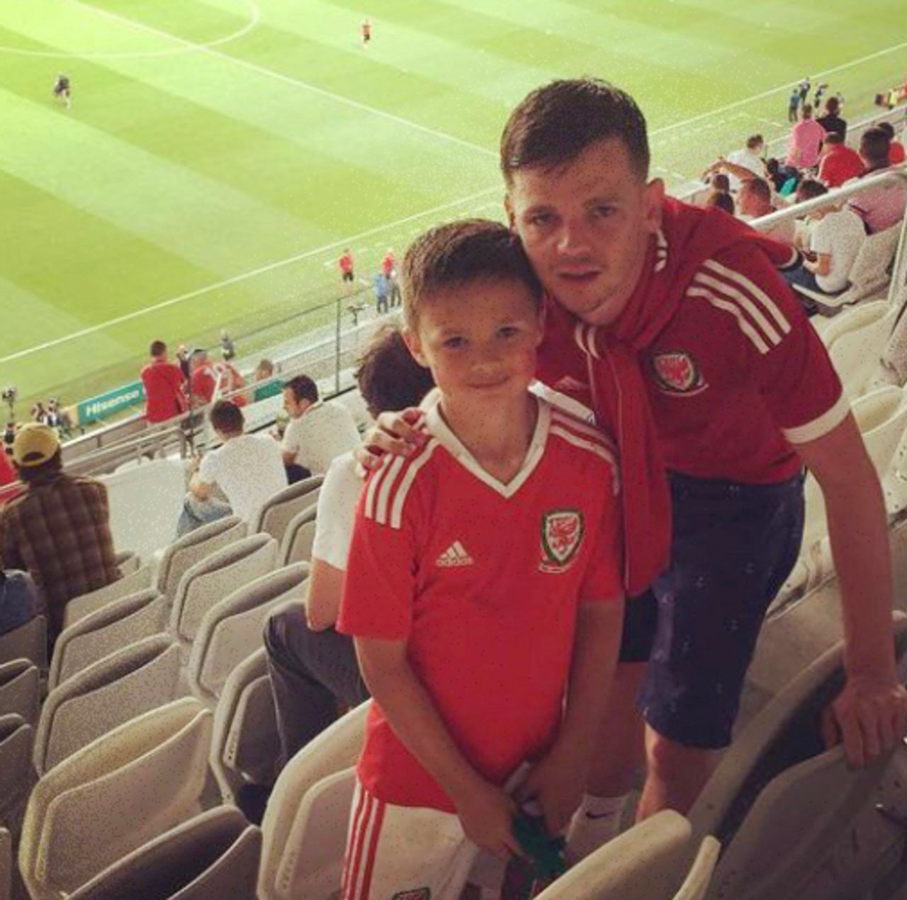 2016年歐洲盃威爾士隊首場比賽中的加雷斯·布魯克曼與兒子。圖片來源:加雷斯·布魯克曼這次他選擇特內里費而非主辦國,因為那裏更有賽事氛圍。“90分鐘的比賽——別誤會,這是我唯一會想念的東西,“在卡迪夫從事青少年足球教練的布魯克曼説,“但對我來説,重要的是整個體驗,能手持一品脱啤酒走在街上。”