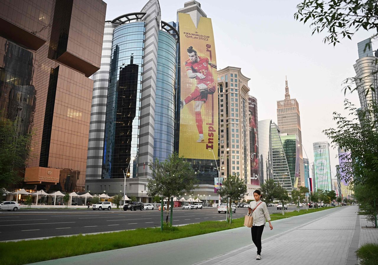 2022年世界盃前夕,卡塔爾多哈一棟建築上懸掛着威爾士足球運動員加雷斯·貝爾的橫幅。圖片來源:保羅·埃利斯/法新社/蓋蒂圖片社