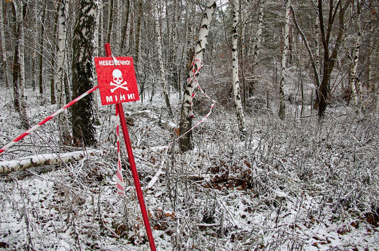 週四,在烏克蘭哈爾科夫地區被收復的Tsyrkuny村附近的森林邊緣,一塊寫着“危險,地雷”的警示牌。照片:sergey kozlov/Shutterstock—Marcus Walker 和 Ann M. Simmons 對本文亦有貢獻。