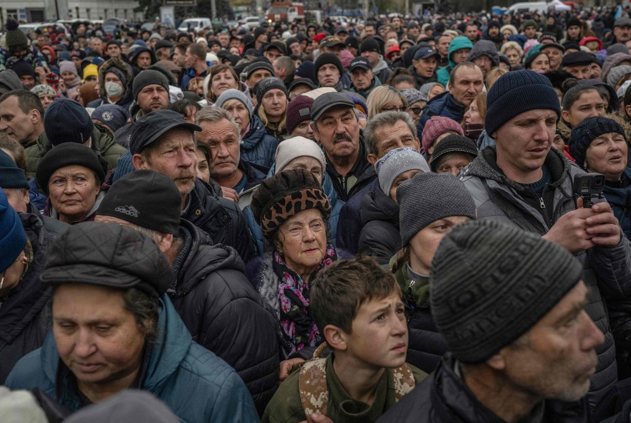上週五,烏克蘭赫爾松市中心,當地居民等待領取援助物資。圖片來源:布倫特·基利克/法新社/蓋蒂圖片社