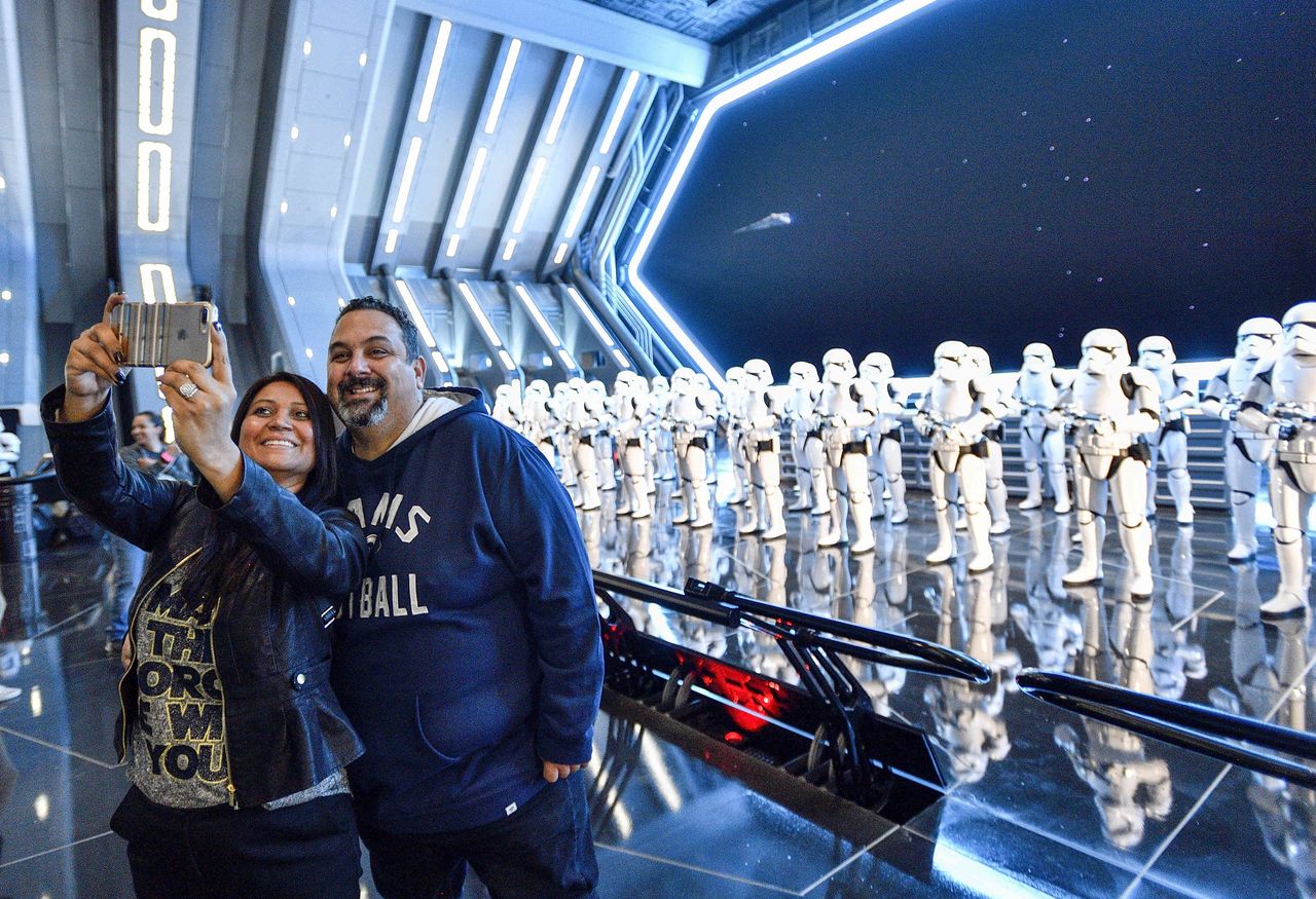 《星球大戰:抵抗組織的崛起》已成為加州阿納海姆迪士尼樂園吸引客流的主力項目。圖片來源:Jeff Gritchen/Zuma Press最近某個工作日,Amie Gasabyan正帶着9歲女兒Ella在迪士尼樂園乘坐《奪寶奇兵》驚險項目,設施突然在漆黑隧道中驟停。