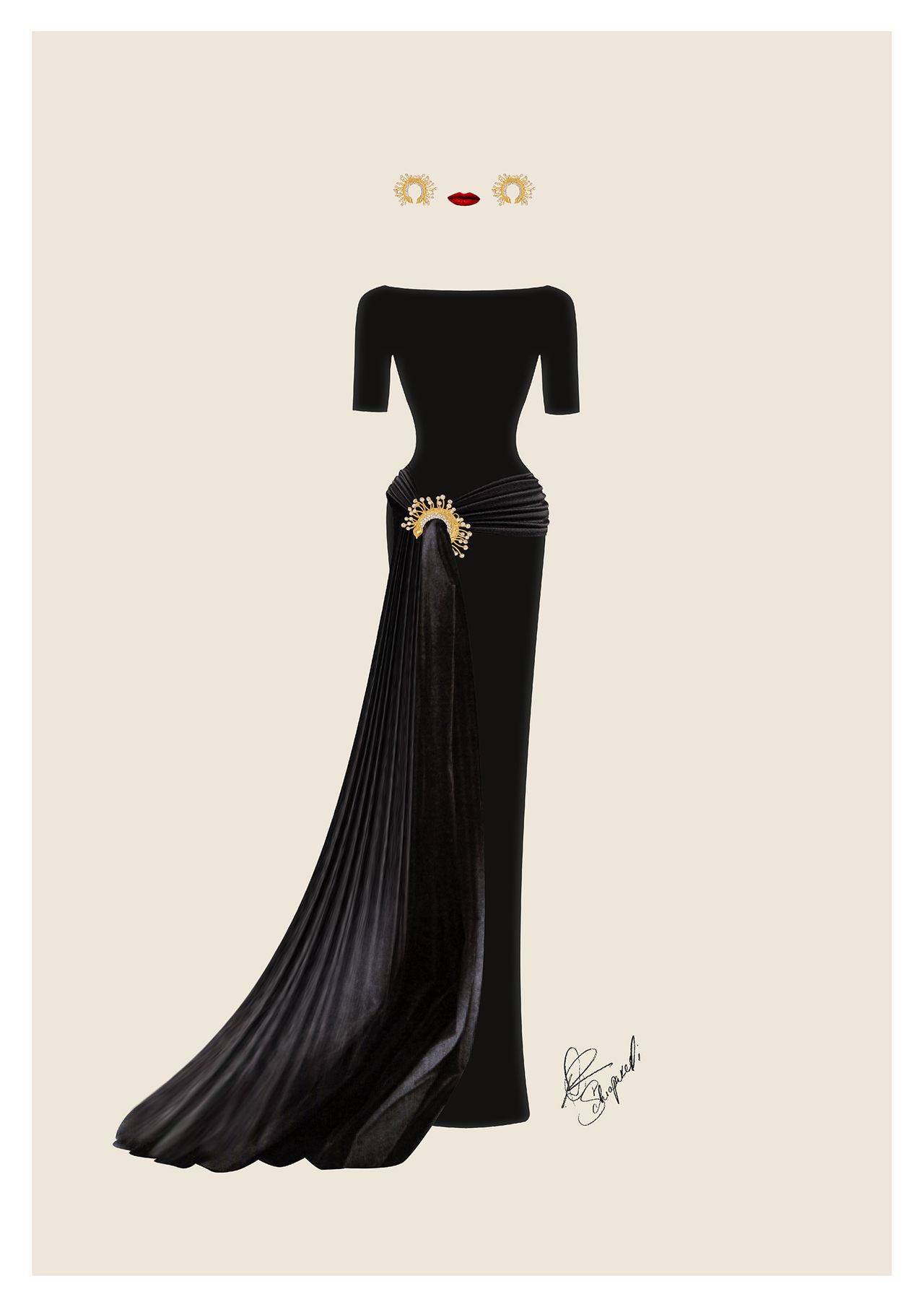 阿黛爾首演造型手稿,這件由Daniel Roseberry為Schiaparelli高級定製特別設計的絲絨直筒禮服,採用船領剪裁,搭配低垂腰飾帶與鑲有金色搭扣和密鑲水晶的細節。圖片來源:Schiaparelli提供由於演出延期開幕及阿黛爾新專輯《30》持續引發熱議(單曲《我飲紅酒》MV上月發佈),米茲拉希此次肩負重任。演出門票幾乎秒罄,部分轉售網站價格已突破兩萬美元。