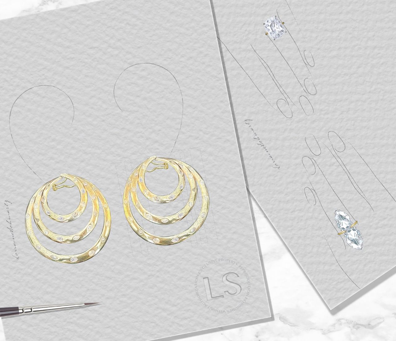 為Adele設計的Lorraine Schwartz珠寶草圖,包括帶有9.32克拉鑽石的金色三重耳環和她在拉斯維加斯駐場首演之夜佩戴的25克拉雙梨形戒指。照片:由Lorraine Schwartz提供DB: 我知道你委託了20件禮服。能告訴我是誰設計的嗎?