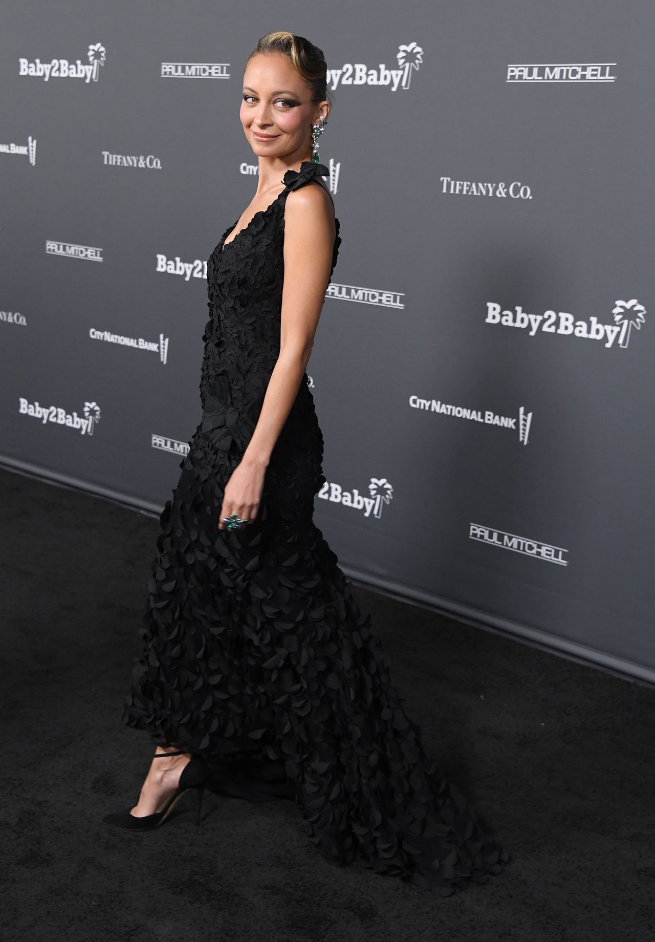 “我們之間有時尚的默契、親近感以及相互的愛與幽默,”妮可·裏奇談到與米茲拉希合作時説道,圖中她身着復古迪奧禮服出席2021年Baby2Baby慈善晚宴。圖片來源:Steve Granitz/WireImage**JM:**我不覺得她認為這是‘新阿黛爾’。她就是她自己,始終保持着本真…為任何人設計造型時,我都會優先考慮最適合其身材的廓形。我們打造的造型讓她感到美麗而自信。