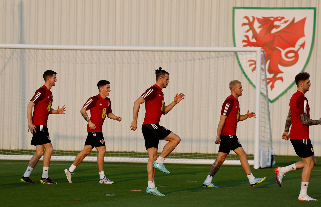 加雷斯·貝爾(中)與隊友在訓練中。圖片來源:SUHAIB SALEM/REUTERS