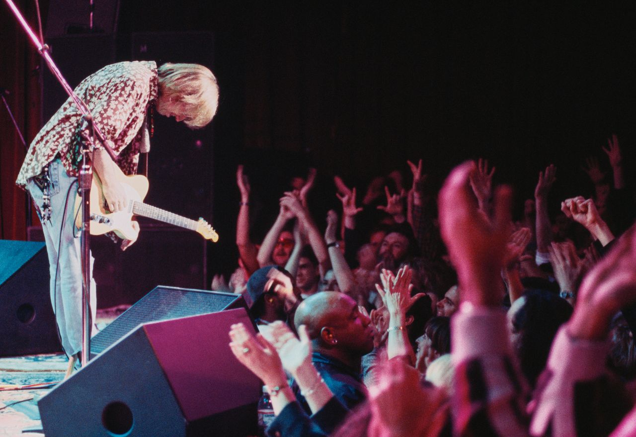 1997年Petty在菲爾莫爾現場攝影:Martyn Atkins兩位特邀嘉賓的出現更凸顯了選曲的標識性:Byrds樂隊的Roger McGuinn(Petty在嗓音上常與之神似並在此稱其為導師)在《It Won’t Be Wrong》中獻上兄弟般親密的和聲二重唱,並參與《Eight Miles High》中翱翔的吉他演奏。藍調宗師John Lee Hooker則帶來了《Boogie Chillen》和Ray Charles的《I Got a Woman》的恢弘改編版。這些超長的藍調曲目並非Heartbreakers樂隊現場或錄音的常規內容,實屬難得的特別呈現。
