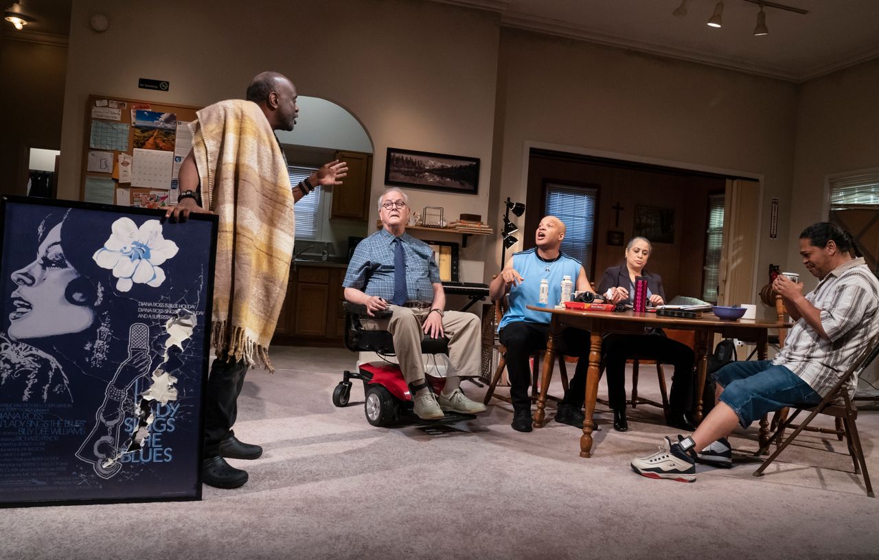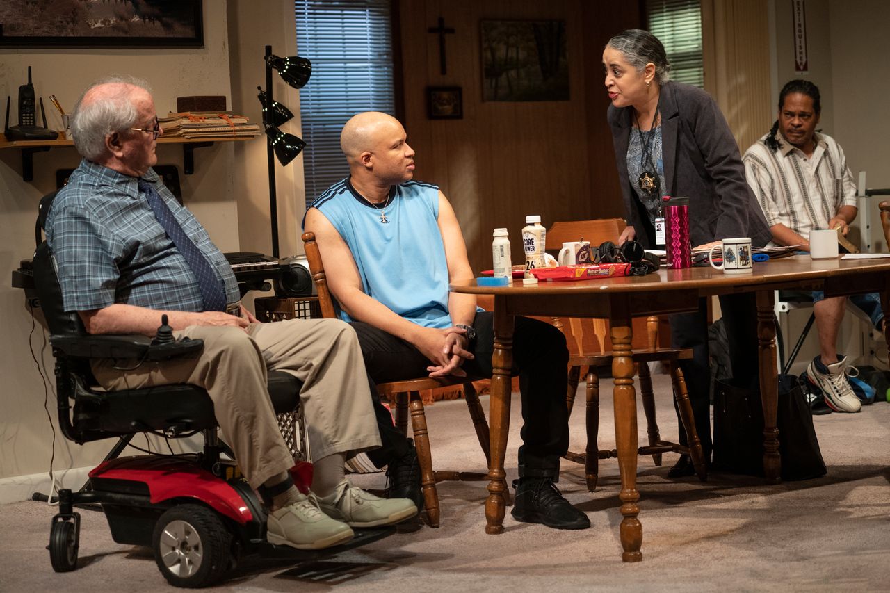 K·託德·弗里曼、弗朗西斯·吉南、格倫·戴維斯、蘇珊娜·古茲曼與埃迪·託雷斯攝影:瓊·馬庫斯如果布魯斯·諾里斯灼人心魄的戲劇《Downstate》沒有讓你感到不適——或許是如坐針氈般的不安——那你必定擁有鋼鐵般的神經。這位普利策獎作品《克萊伯恩公園》的作者,在其最新且最出色的劇作中,描繪了一羣曾因性侵未成年人服刑後、現居住於集體之家的居民生活中的漫長一日——單是這個戲劇設定本身就令人不安。