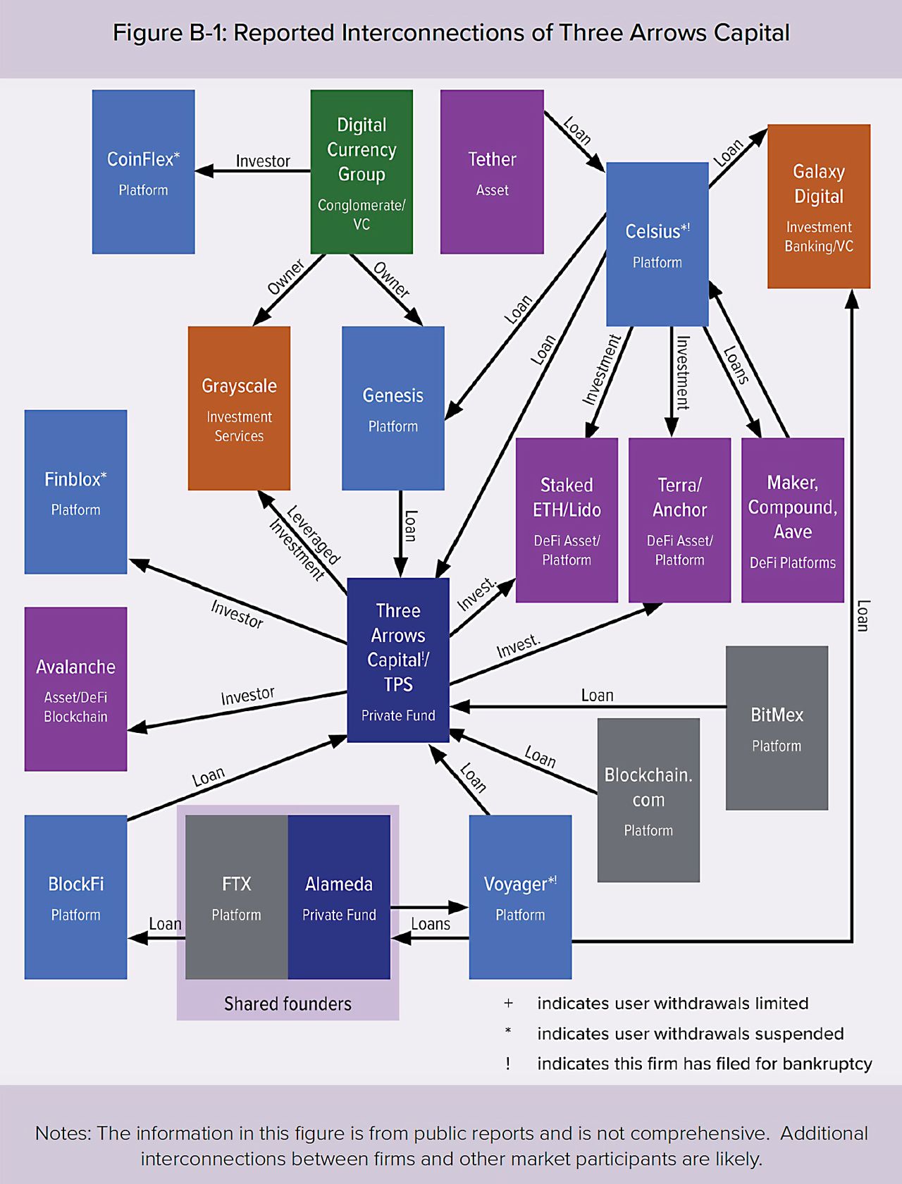 聯邦金融穩定監督委員會10月報告中的圖表,展示了加密貨幣領域相互關聯的特性。從缺乏經驗的個人投資者到大型風投和養老基金,部分投資者遭受了損失,有些甚至改變人生軌跡。但這些損失在性質上不同於威脅大型貸款機構償付能力及整個金融體系穩定的那種損失。