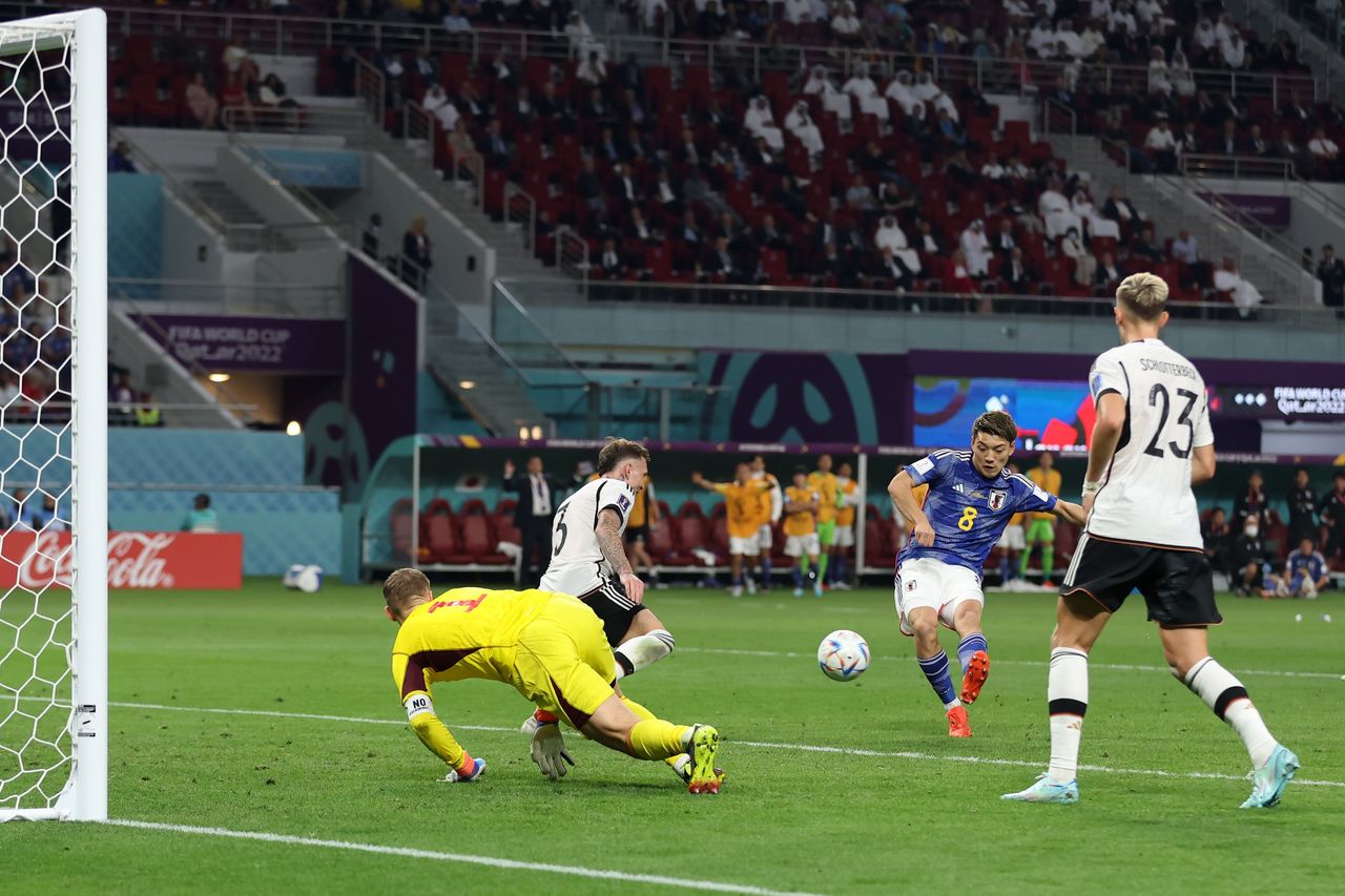 日本的堂安律為球隊打入首球。圖片來源:Alex Grimm/Getty Images儘管週三的比賽中控球率僅有24%,日本隊仍成功破門。這支被稱為"藍色武士"的球隊在下半場發起猛攻,由兩位熟悉德國足球的替補球員在八分鐘內連入兩球——他們均效力於德甲俱樂部。弗賴堡隊的堂安律在第75分鐘扳平比分,隨後波鴻隊的淺野拓磨越過門將曼努埃爾·諾伊爾的防守打入制勝球。